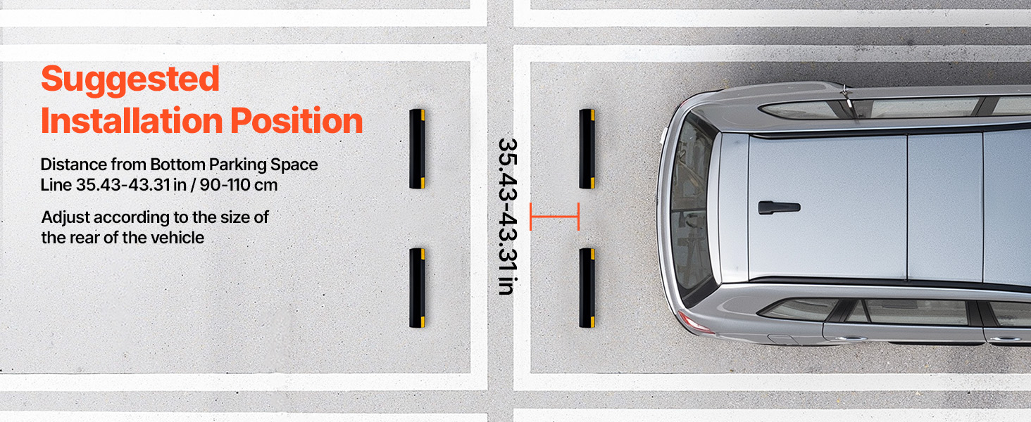 Odporúča sa inštalovať vo vzdialenosti 35,43-43,31 in/90-110 cm od spodnej parkovacej čiary. Náš parkovací doraz je možné nastaviť podľa veľkosti zadnej časti vozidla. Presná inštalácia zabraňuje nárazu vozidla do steny pri cúvaní.