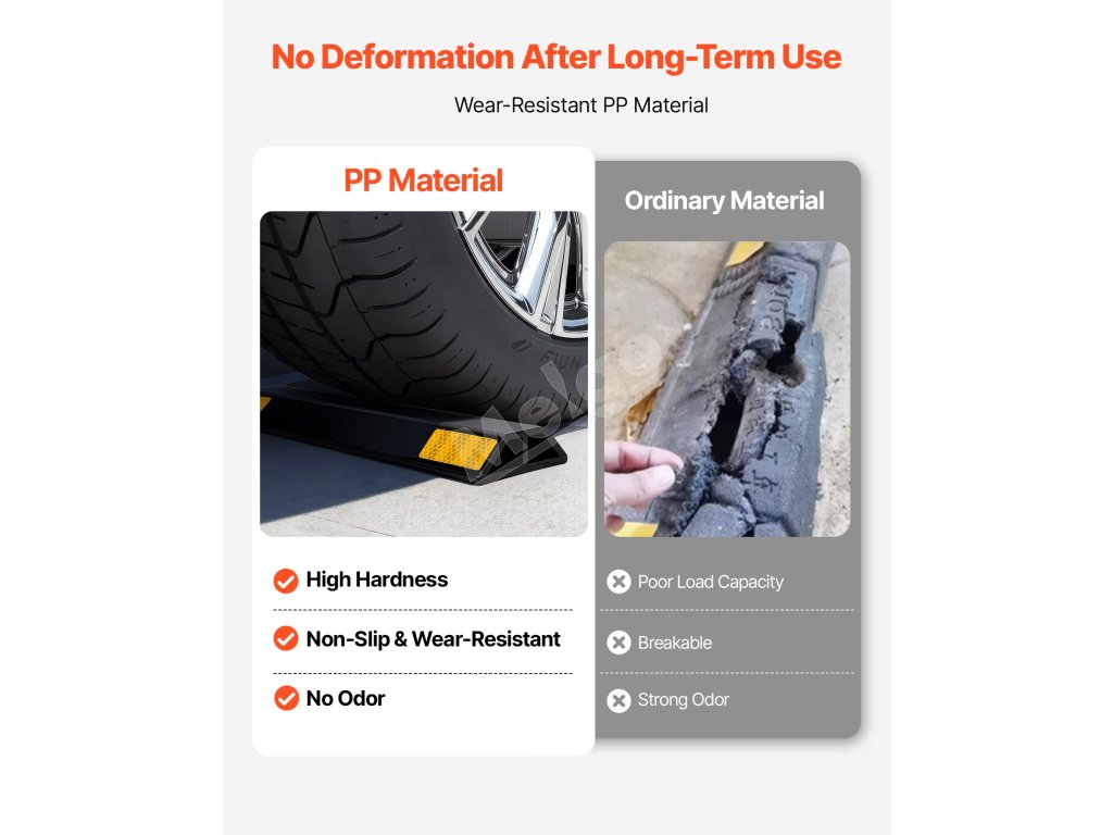 Parkovací obrubník je skonštruovaný so silnou nosnosťou, vďaka čomu vydrží drvenie pneumatík bez prasknutia. Konštrukcia odolná voči slnečnému žiareniu udržiava farbu reflexných pásikov dlhodobo jasnú.