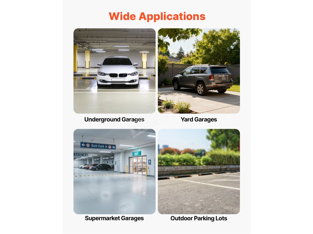 Odporúča sa inštalovať vo vzdialenosti 35,43-43,31 in/90-110 cm od spodnej parkovacej čiary. Náš parkovací doraz je možné nastaviť podľa veľkosti zadnej časti vozidla. Presná inštalácia zabraňuje nárazu vozidla do steny pri cúvaní.