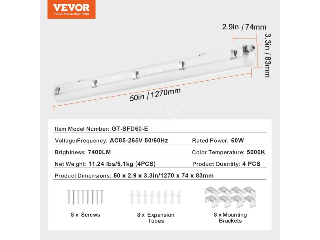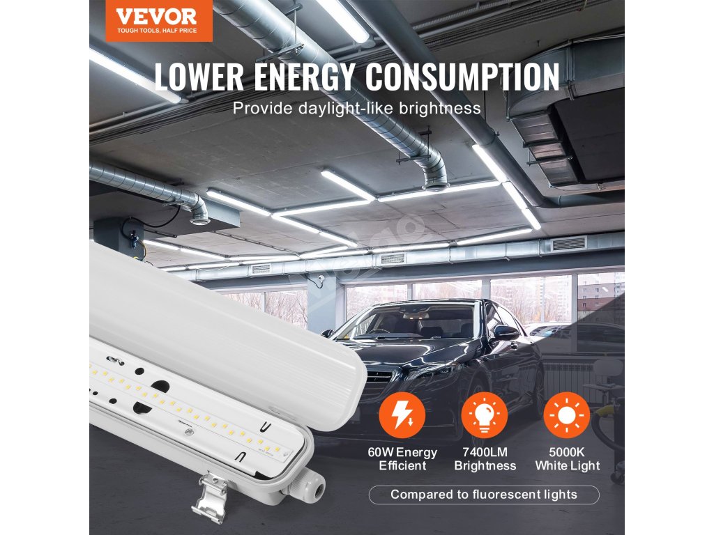 Spotrebováva iba 60 W energie a poskytuje jasných 7400 lúmenov. S teplotou farieb 5000K pripomínajúcou denné svetlo a vodotesnosťou IP65 je ideálne do vonkajšieho, polovonkajšieho a chladného prostredia, ako sú parkoviská, mraziace boxy atď. Osvetlite svoj priestor efektívne so svietidlom VEVOR!