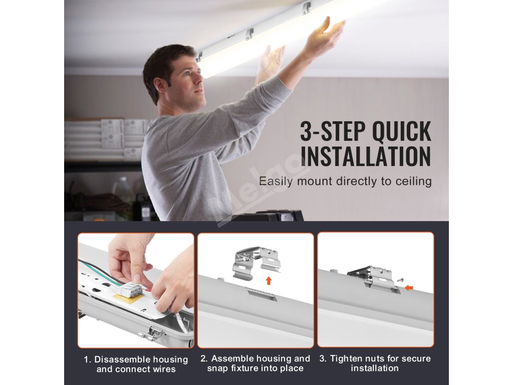 Naše parotesné svietidlo LED ponúka viacero spôsobov inštalácie: môžete ho namontovať priamo na stropy alebo steny pomocou priložených montážnych konzol alebo zavesiť na stropy pomocou lán (nie sú súčasťou balenia). Vďaka jednoduchému procesu inštalácie v 3 krokoch je rýchla a bezproblémová, čo vám ušetrí čas a námahu.