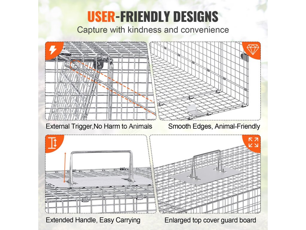 Rukoväť je navrhnutá tak, aby vás chránila pri premiestňovaní pasce na mývaly. Hladké okraje drôteného pletiva chránia zvieratá pred poranením. Vonkajšia páka pasce zabraňuje náhodnému spusteniu. Menšia veľkosť ôk zaisťuje, že zvieratá nemôžu uniknúť alebo ukradnúť návnadu, dokonca sa bránia proti útokom divej zveri.