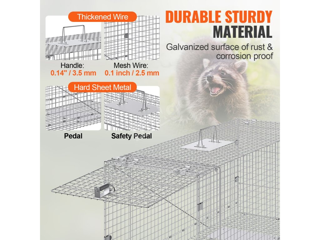 Naša pasca na zvieratá je vyrobená z 0,1"/2,5 mm hrubého drôtu. Ľahko odoláva zápasom a uhryznutiam divých zvierat. Pozinkovaná povrchová úprava maximalizuje odolnosť proti korózii a hrdzi, čím zabezpečuje dlhú životnosť aj v náročných vonkajších podmienkach.