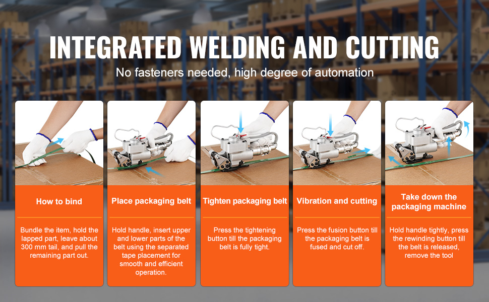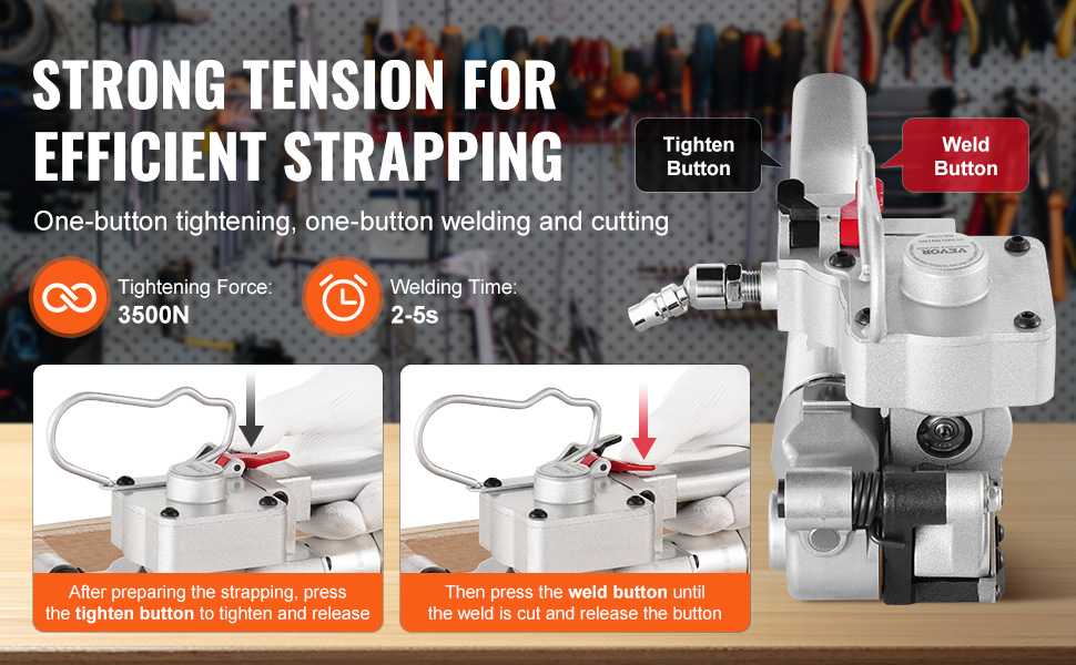 Tento pneumatický páskovač je vysoko automatizovaný a ľahko sa používa. Je vybavený tepelným zváraním trením, takže nie sú potrebné žiadne spojovacie prvky. Zváranie a rezanie prebieha plynulo v jednom kroku. Rýchlospojky vzduchovej hadice umožňujú jednoduché nastavenie, vďaka čomu sa môžete pustiť do práce rýchlejšie a efektívnejšie.