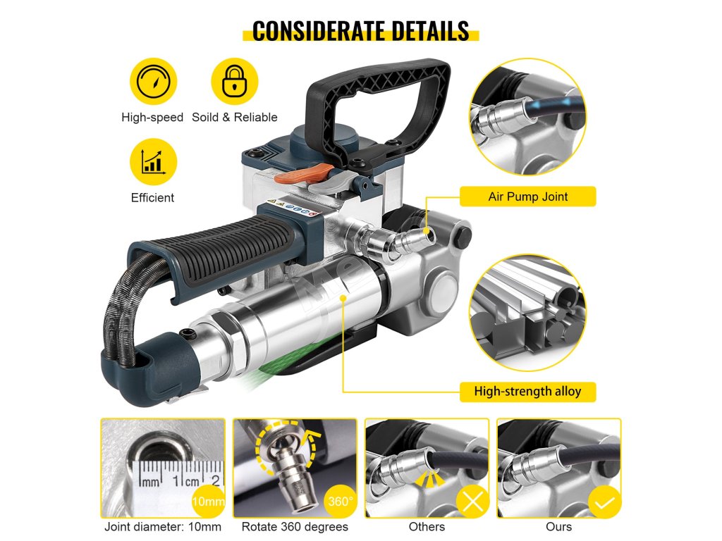Tento pneumatický páskovač je vysoko automatizovaný a ľahko sa používa. Je vybavený tepelným zváraním trením, takže nie sú potrebné žiadne spojovacie prvky. Zváranie a rezanie prebieha plynulo v jednom kroku. Rýchlospojky vzduchovej hadice umožňujú jednoduché nastavenie, vďaka čomu môžete začať pracovať rýchlejšie a efektívnejšie.