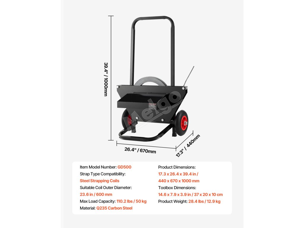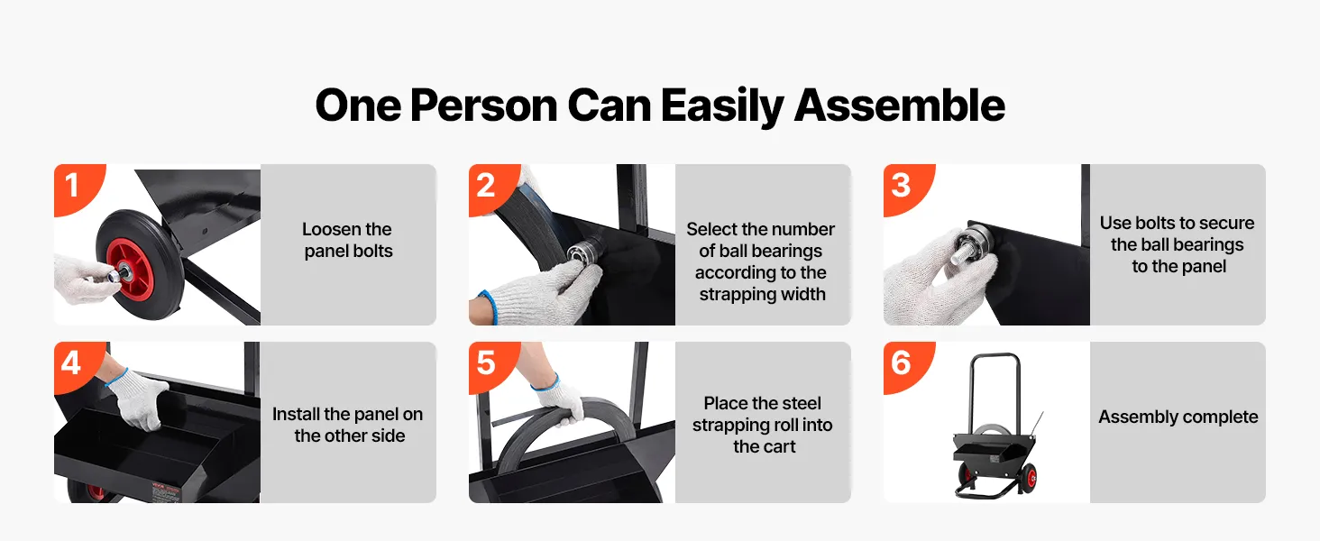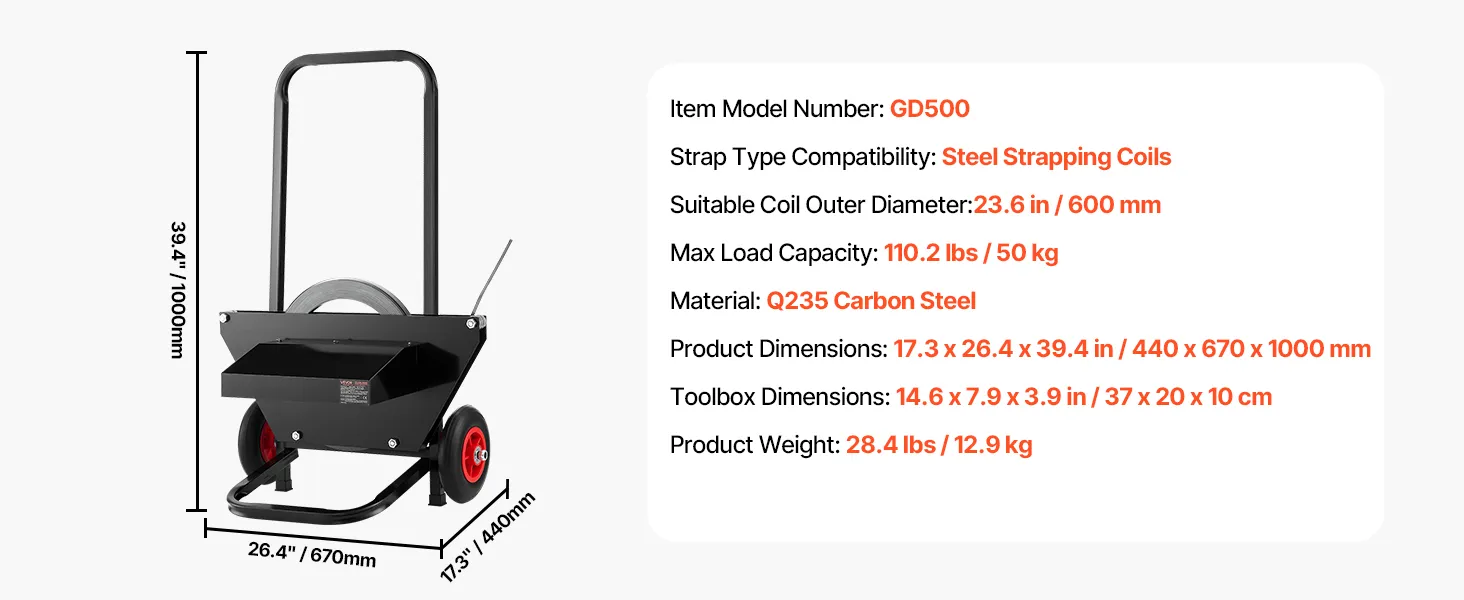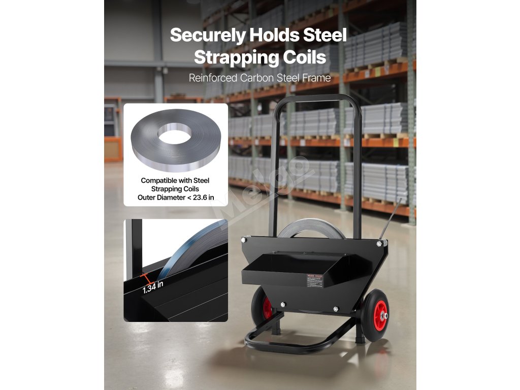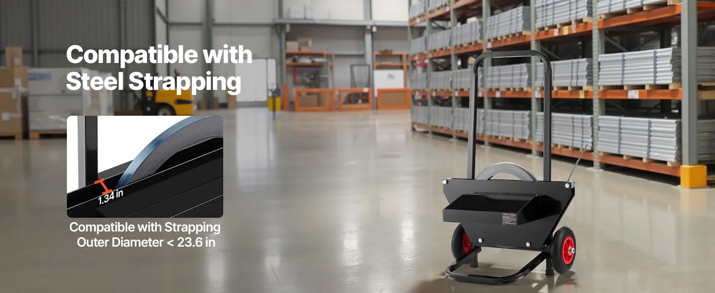 Tento páskovací vozík je vhodný pre kotúče oceľovej pásky s vonkajším rozmerom jadra 23,6 palca a je vybavený zabudovanými kovovými guličkovými ložiskami pre jednoduché a efektívne používanie pásky.