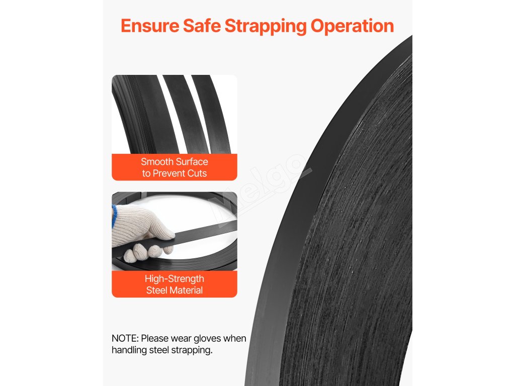Naša rolka na páskovanie bola špeciálne upravená pre hladké okraje bez drsných miest a otrepov. Voskovaná povrchová úprava pomáha chrániť vaše obaly. Pre väčšiu bezpečnosť odporúčame pri práci s oceľovou páskou používať baliace rukavice.