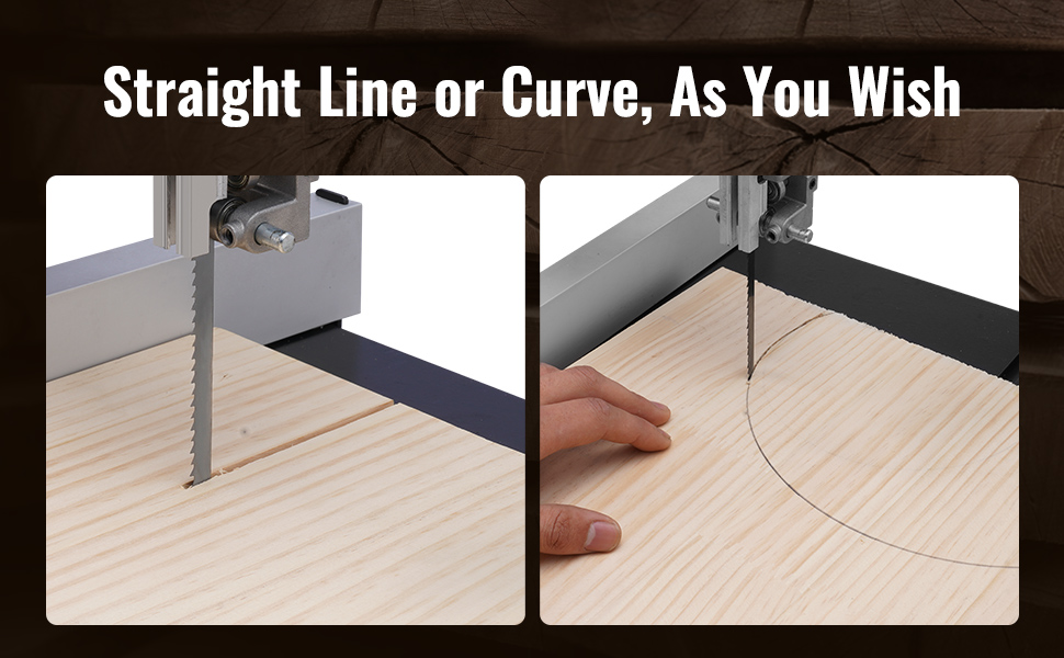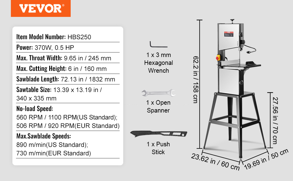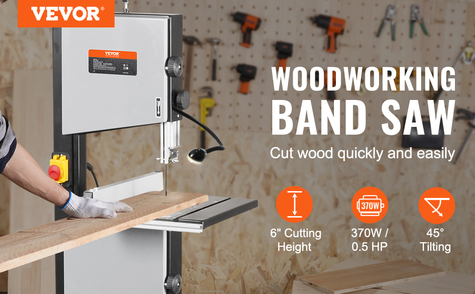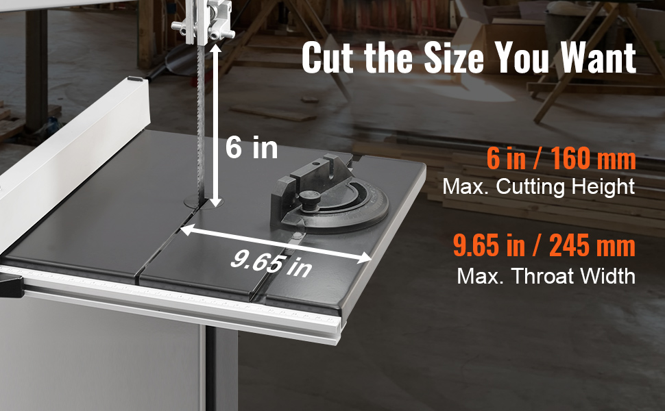 Pásová píla VEVOR na drevo má výšku rezu 6 palcov/160 mm, šírku rezu 9,65 palca/245 mm a motor 1/2 HP 375 W. Je tiež vybavená nastaviteľnými rýchlosťami, optimalizovaným pracovným osvetlením a robustným stojanom pre jednoduché používanie. Režte s istotou s pásovou pílou VEVOR!