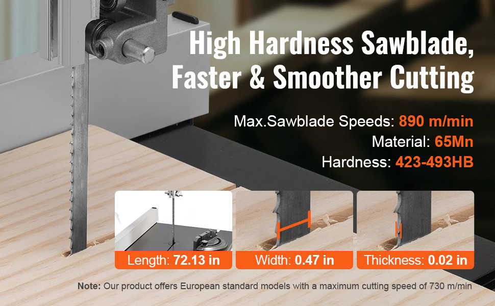 Dĺžka pílového kotúča je 72,13 palca/1832 mm a je vyrobený zo 65Mn pre väčšiu robustnosť. Maximálna rýchlosť: 890 m/min, hrúbka: 0,02 palca/0,5 mm, tvrdosť: 0,02 palca/0,5 mm: 423-493 HB. Poznámka: Náš výrobok ponúka európske štandardné modely s maximálnou reznou rýchlosťou 730 m/min.