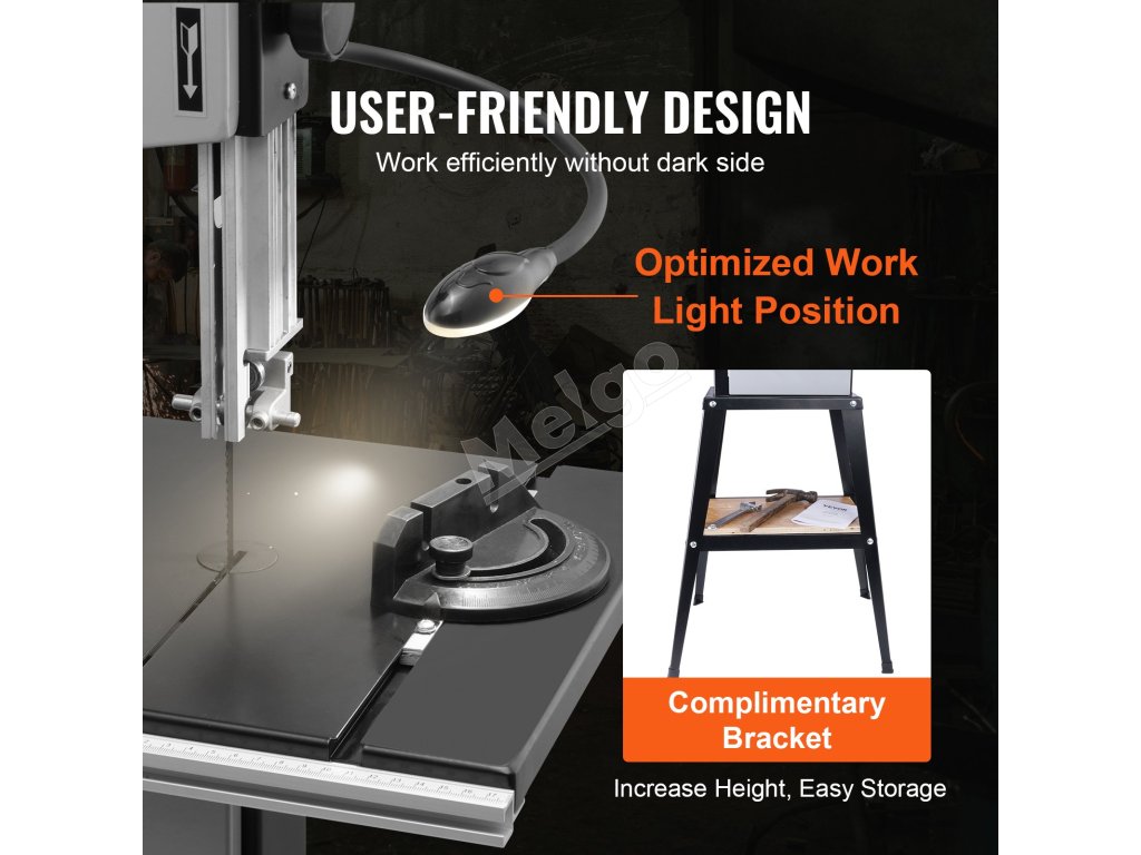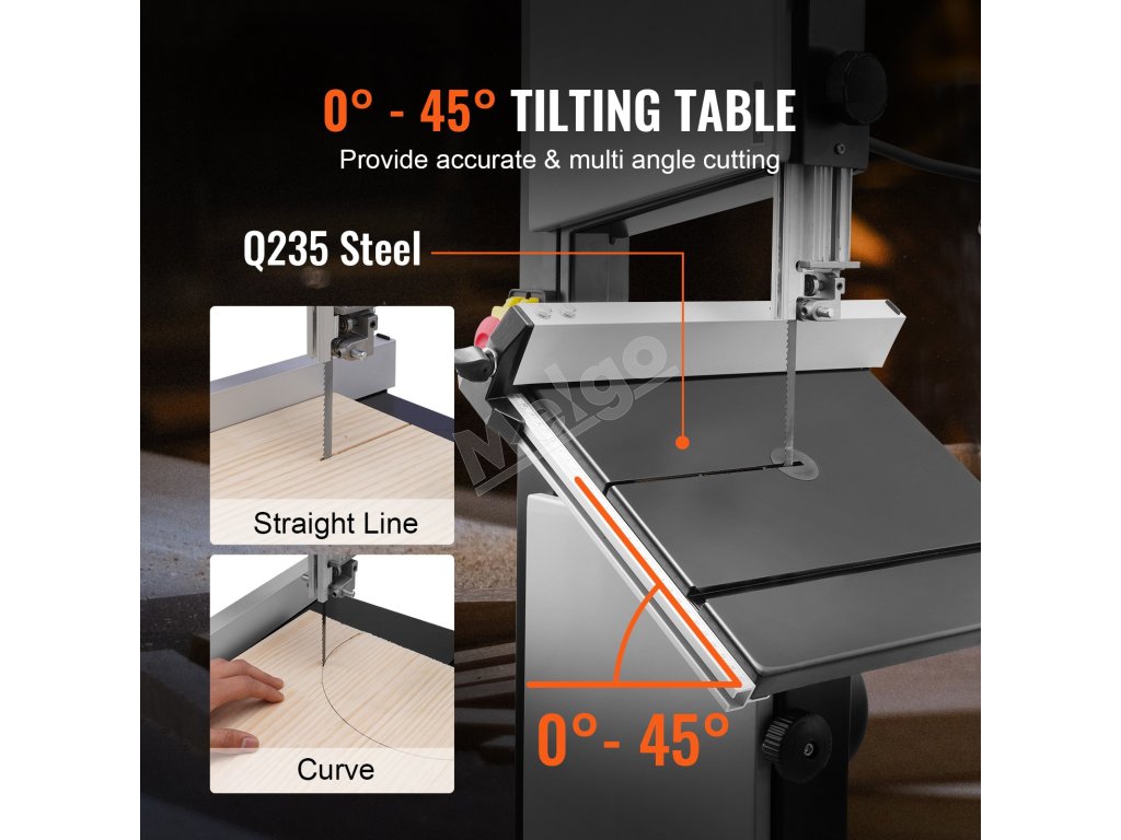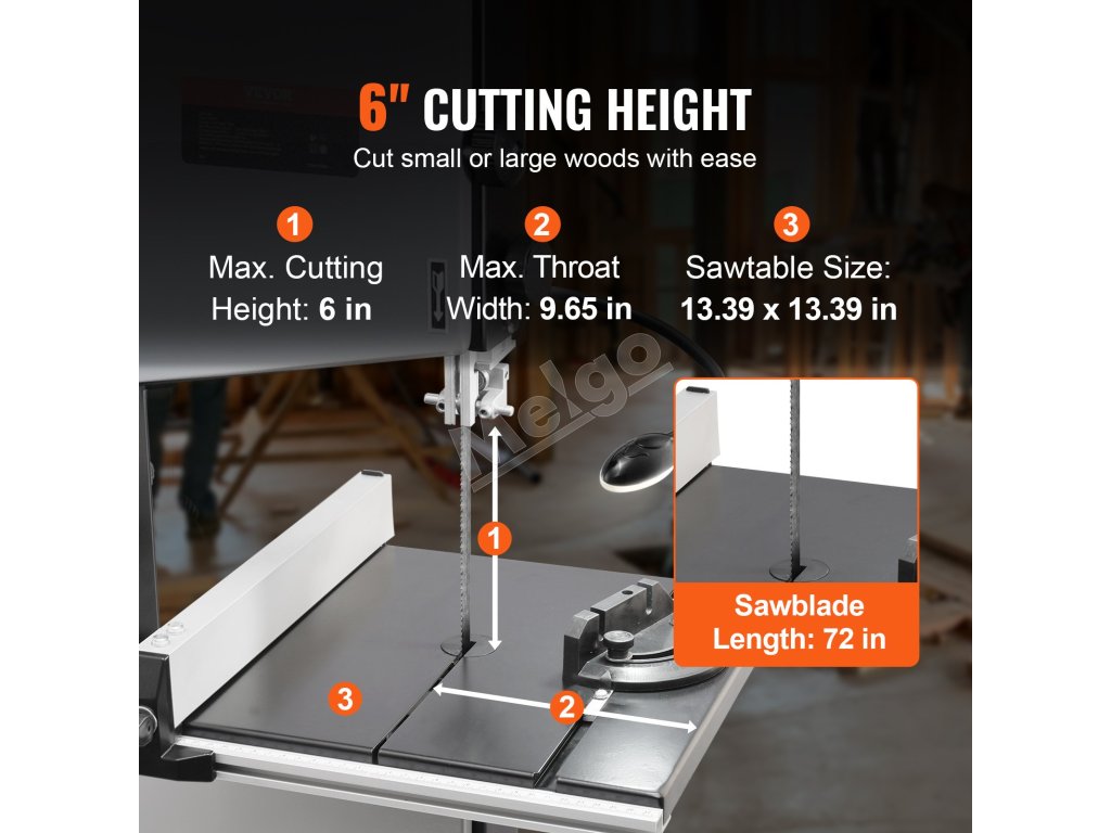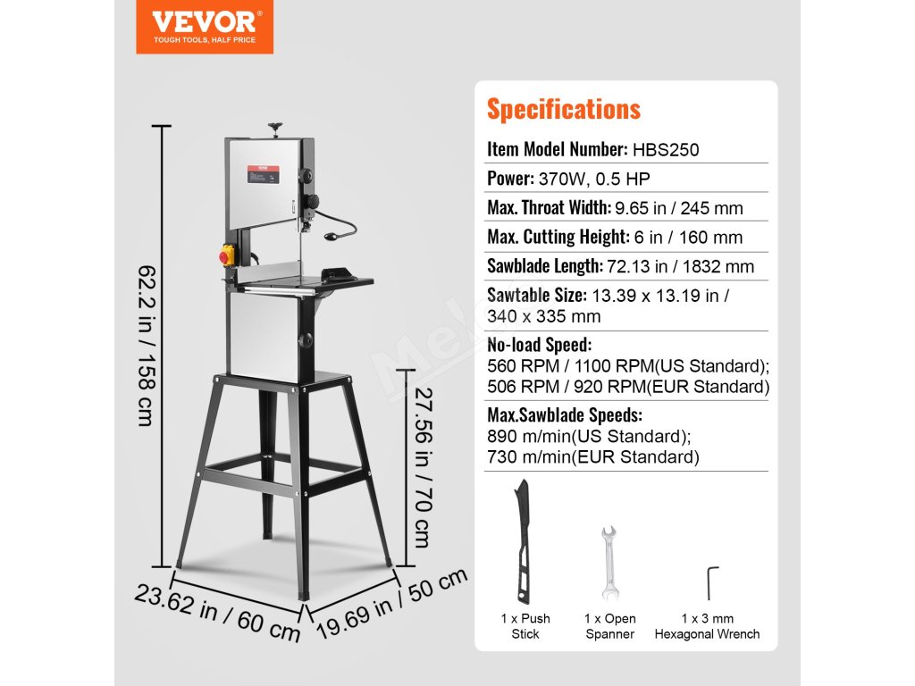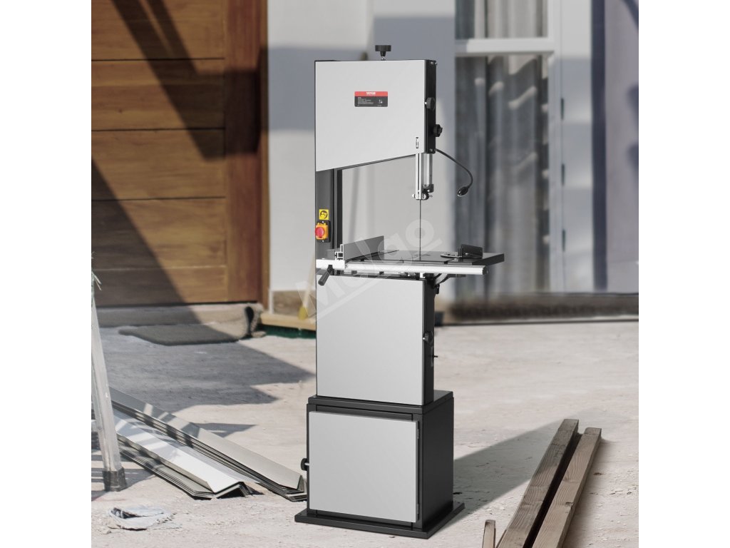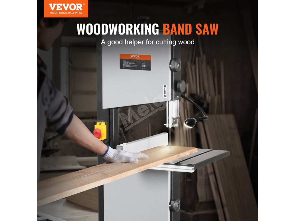 Pásová píla VEVOR na drevo má výšku rezu 6 palcov/160 mm, šírku rezu 9,65 palca/245 mm a motor 1/2 HP 375 W. Je tiež vybavená nastaviteľnými rýchlosťami, optimalizovaným pracovným osvetlením a robustným stojanom pre jednoduché používanie. Režte s istotou s pásovou pílou VEVOR!