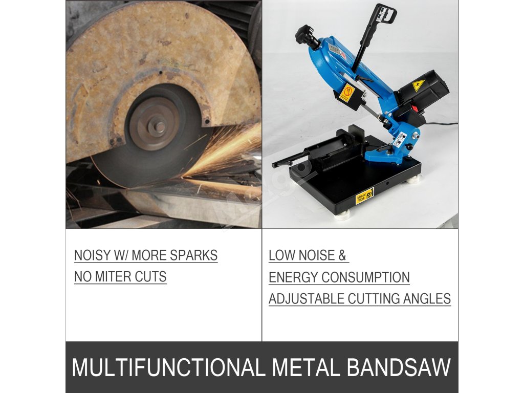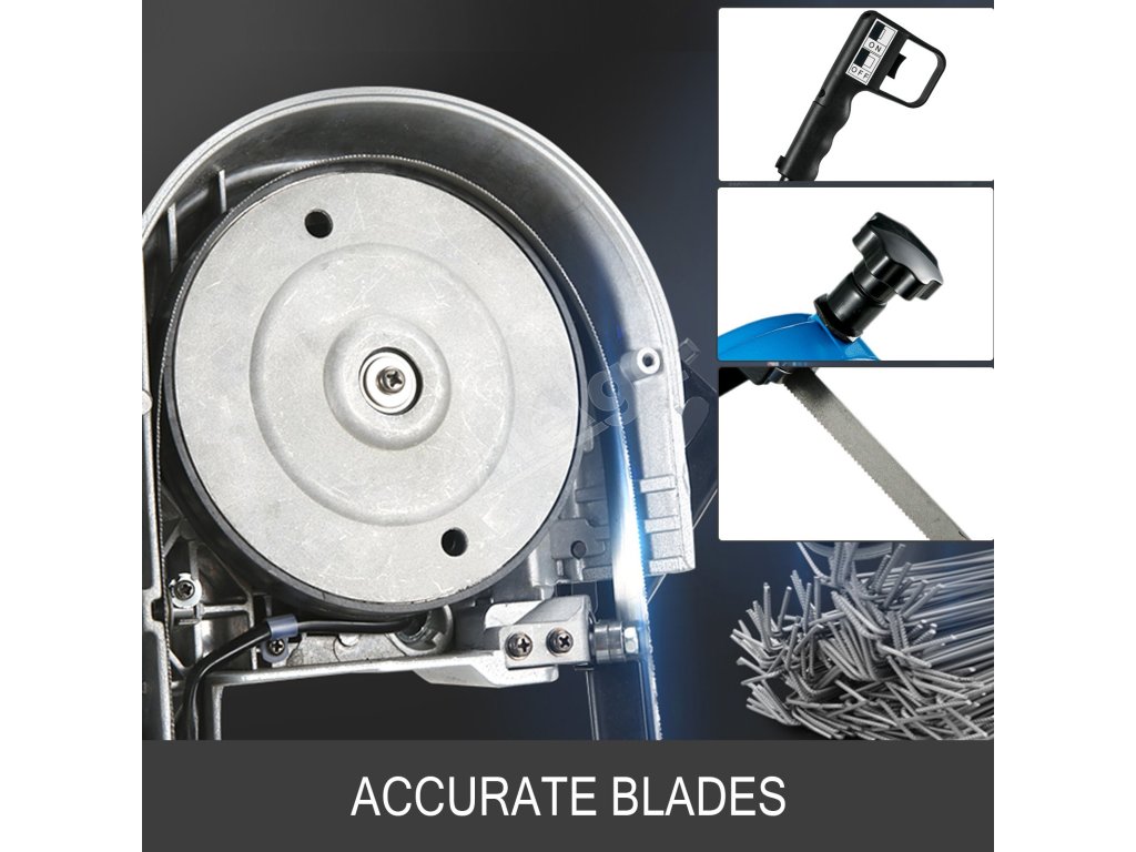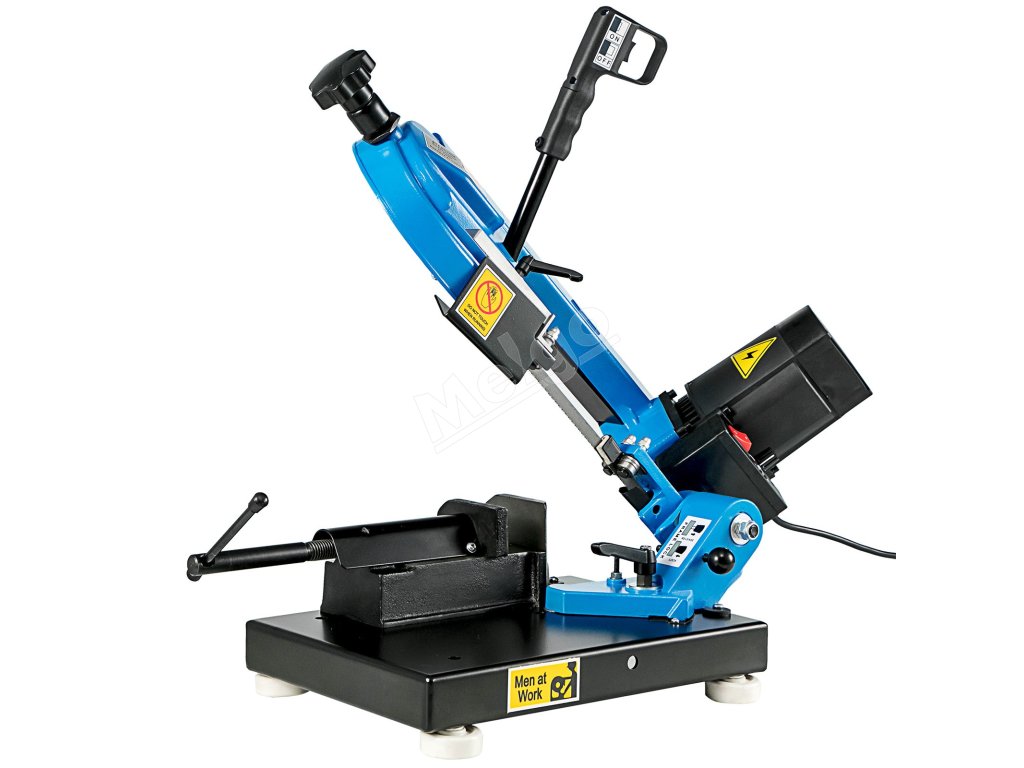 Horizontálna pásová píla ručnej konštrukcie s vypínačom, jednoduchá obsluha jednou rukou.