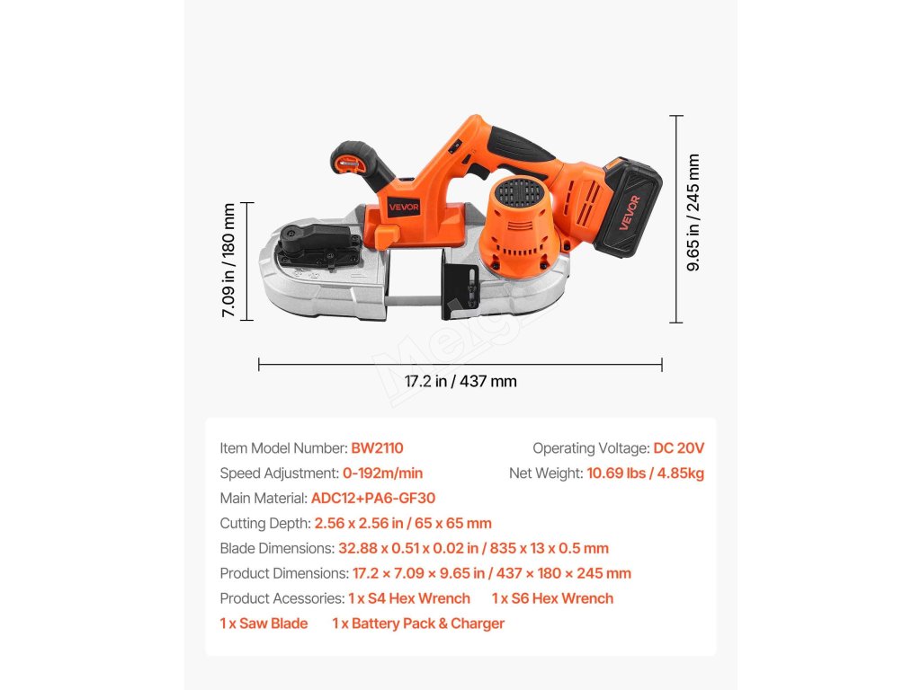 Prenosná pásová píla 20 V/AC 220 V, 360 W, 65×65 mm, 4,0 Ah na kov