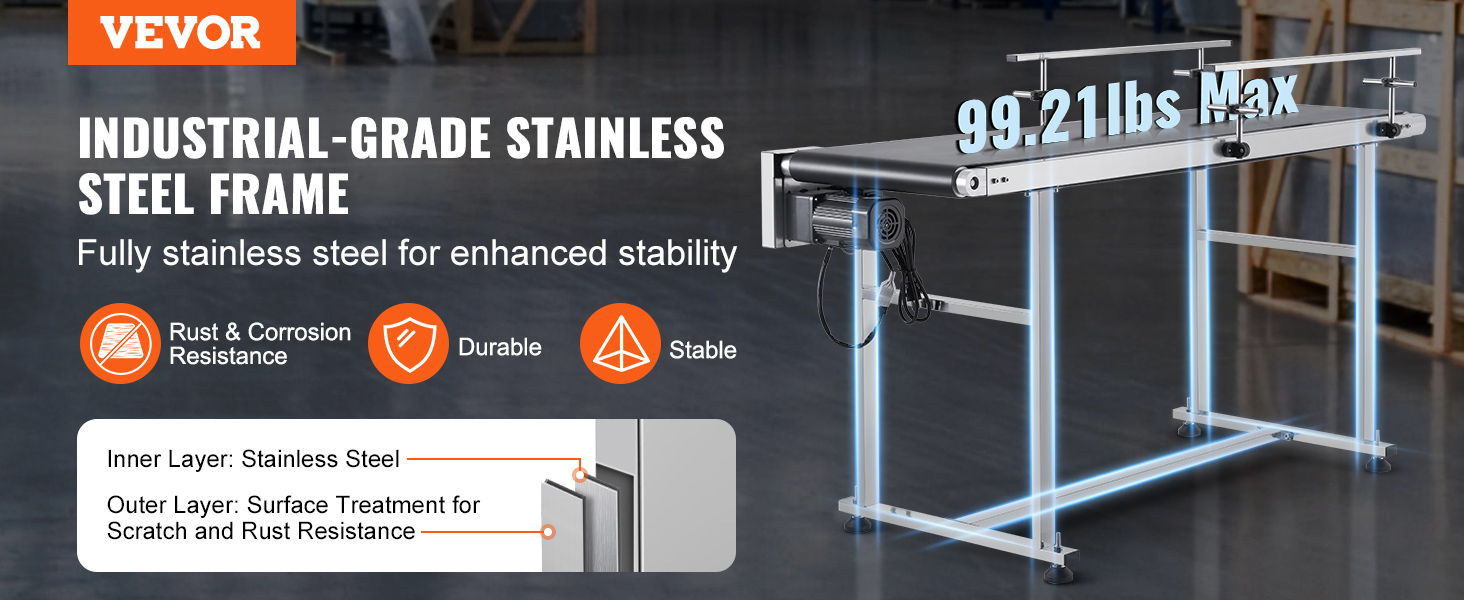 Rozlúčte sa s chatrnými dopravníkmi! Náš pásový dopravník sa môže pochváliť pevnou konštrukciou z nehrdzavejúcej ocele, ktorá zaisťuje stabilitu a odolnosť a zvládne ťažké zaťaženie a dlhé hodiny ako profesionál. Navyše jeho vonkajší povrch odolný proti poškriabaniu a hrdzi ho udrží v dobrej kondícii aj v náročných podmienkach.