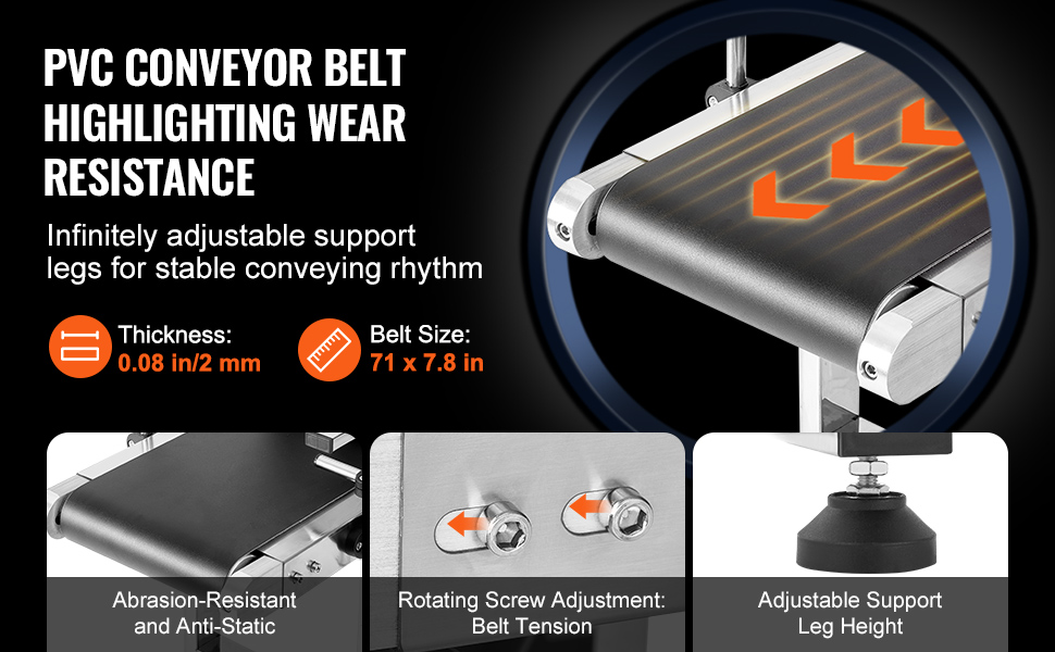 Pás z PVC priemyselnej triedy nášho dopravníka sa vyznačuje odolnosťou proti opotrebovaniu a antistatickými vlastnosťami, vďaka čomu bez námahy manipuluje s predmetmi všetkých veľkostí. A nastavenie napnutia je vďaka otočnému skrutkovaciemu mechanizmu hračka!
