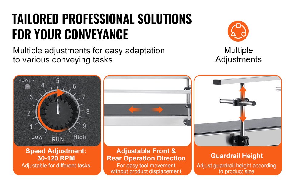 Náš plochý pásový dopravník z PVC má o vás postarané vďaka možnosti multifunkčného nastavenia. Od nastaviteľných rýchlostí (30 až 120 ot./min.) až po obojsmernú prevádzku - prispôsobí sa vašim potrebám. S prispôsobiteľnou výškou ochrannej lišty je zaistená bezpečnosť a efektívnosť!