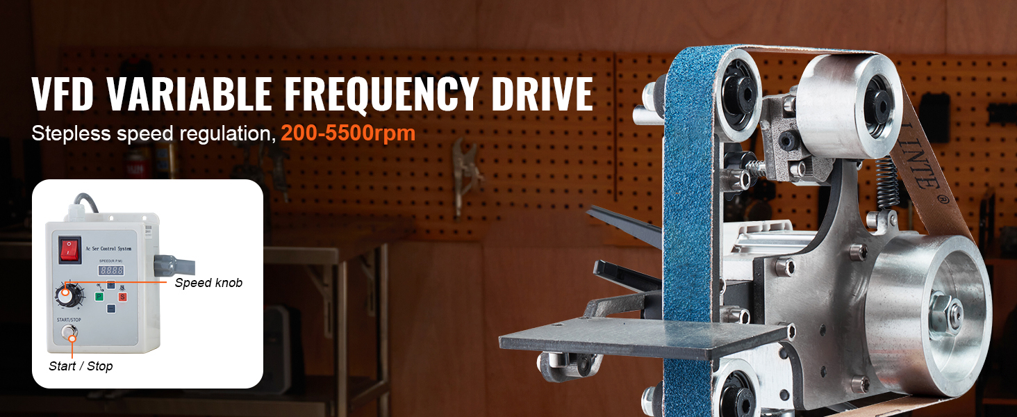 Táto pásová brúska s lineárnou rýchlosťou 26 m/min a vybavená frekvenčným meničom VFD umožňuje plynulú reguláciu otáčok. Bez námahy prepínajte medzi vysokorýchlostným rýchlym a nízkorýchlostným jemným brúsením na zvýšenie efektivity práce.