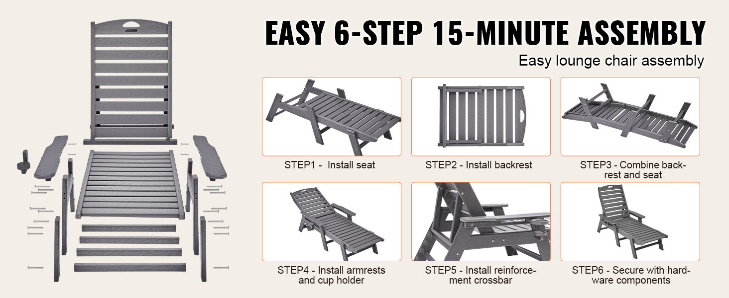 Všetky kľúčové časti sú označené a vďaka podrobnému návodu je montáž hračka. Svoje nové plastové lehátko si zostavíte už za 25 minút a nepotrebujete žiadne ďalšie náradie!