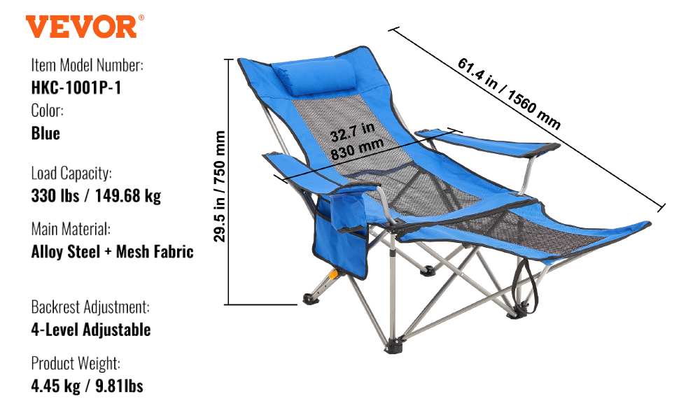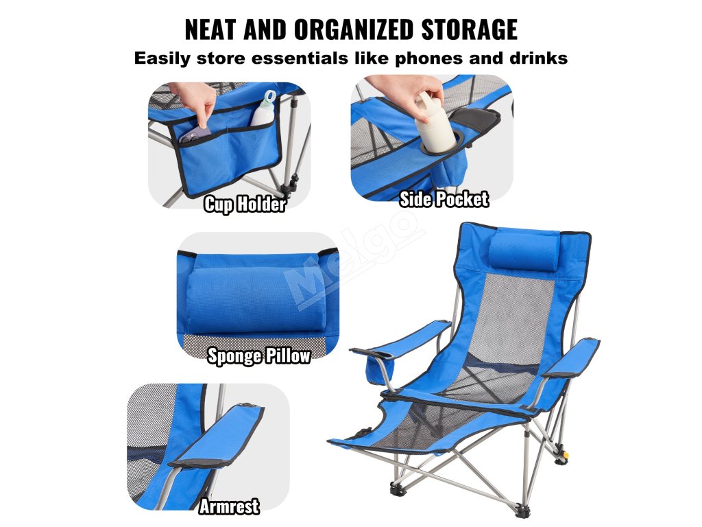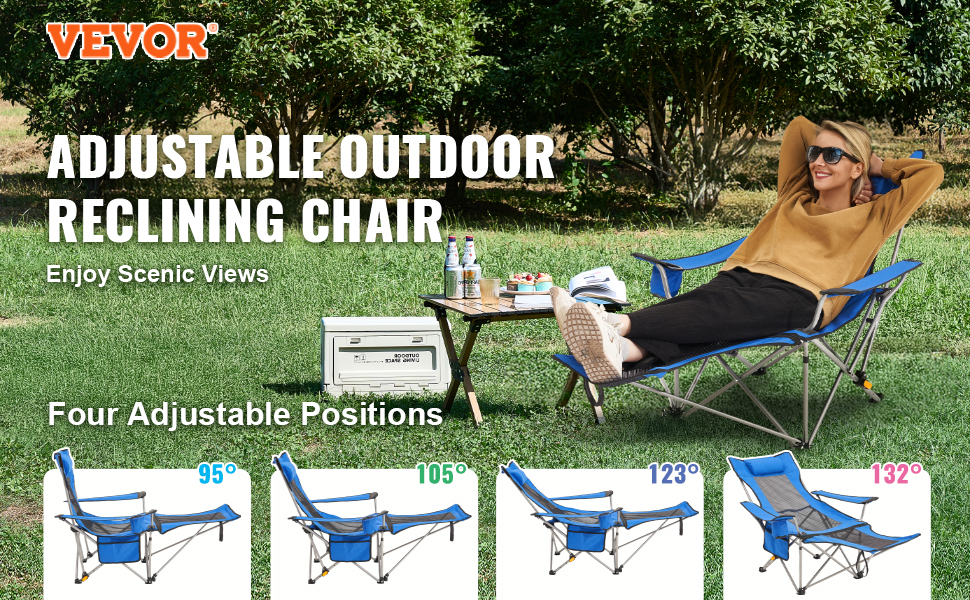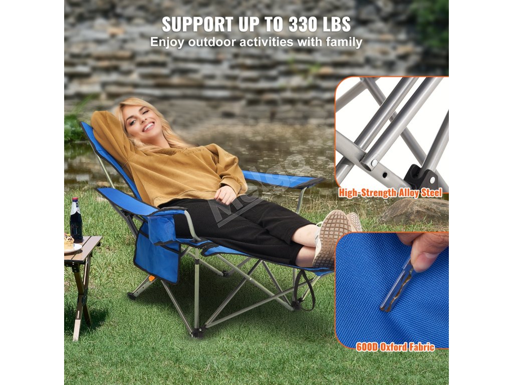 Toto polohovateľné kempingové kreslo unesie až 330 kg a má štyri nastavenia výšky. Je vyrobené z odolnej legovanej ocele a tkaniny 600D Oxford, je ľahké a ľahko sa prenáša. Obsahuje podrúčky, bočné vrecko a držiak na pohár - skvelé na kempovanie alebo na pláž!