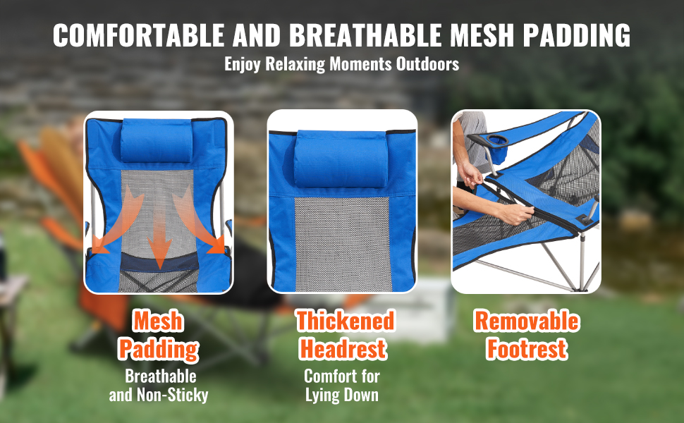 Naše vonkajšie polohovateľné kreslo je priedušné a pohodlné, vyrobené z luxusnej sieťoviny a s odnímateľnou opierkou na nohy. Hrubá opierka hlavy poskytuje dodatočnú oporu a odnímateľná opierka nôh vám umožní prispôsobiť si pohodlie, čo vám zaručí zážitok ako doma pri kempovaní.