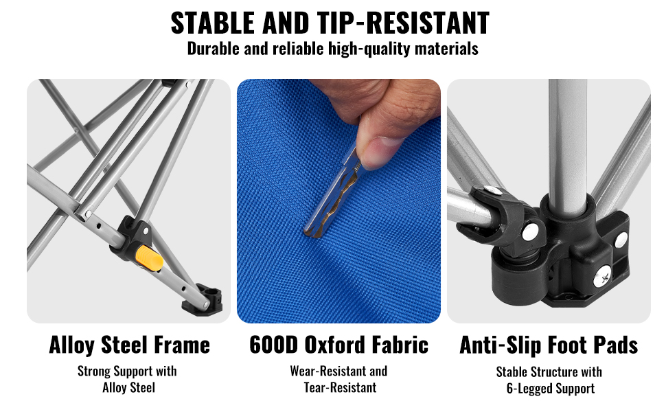 Toto odolné a podporné kempingové kreslo je vyrobené z vysokopevnostnej legovanej ocele a tkaniny 600D Oxford. Protišmykové podložky pod nohy a konštrukcia so šiestimi nohami zabezpečujú stabilitu počas používania v exteriéri.