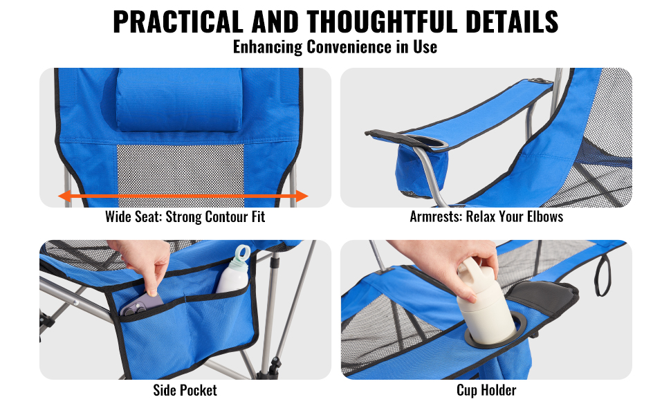 Vďaka širokému sedadlu pre väčšie pohodlie, relaxačným podrúčkam a praktickým bočným vreckám s držiakom na poháre vám toto prenosné kreslo umožní bezproblémové aktivity v prírode, ako je čítanie a popíjanie nápojov.