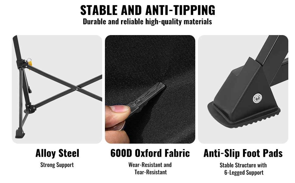 Vďaka pevnému rámu zo zliatiny ocele a odolnej tkanine 600D Oxford toto polohovateľné kempingové kreslo unesie až 300 kg. Jeho protišmykové podložky pod nohy a konštrukcia so šiestimi nohami ho udržiavajú stabilné, aby ste mohli bez obáv relaxovať.