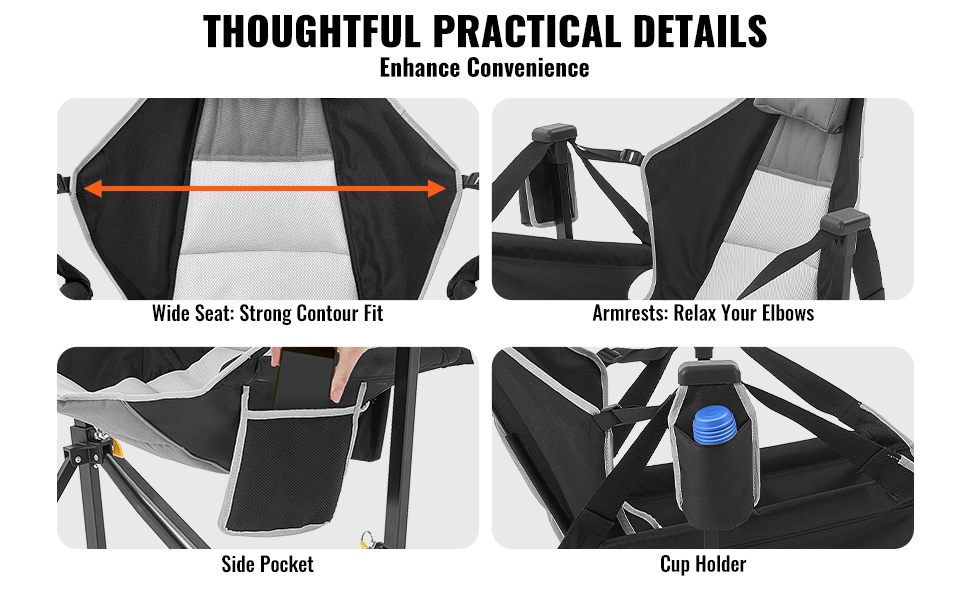 Premyslené dizajnové detaily robia toto hojdacie kempingové kreslo ešte lepším. Širšie sedadlo ponúka viac priestoru na relaxáciu, zatiaľ čo opierky na ruky udržia vaše lakte v pohodlí. Bočné vrecko a držiak na pohár sú ideálne na vaše nevyhnutné veci, či už na čítanie, popíjanie nápoja alebo občerstvenie.