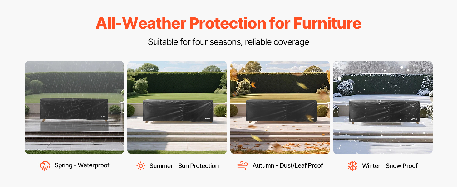 Na jar je nepremokavý, v lete odolný proti slnku, na jeseň chráni pred prachom a lístím a v zime odoláva vetru a snehu. Tento poťah na terasový stôl a stoličky ponúka všestrannú ochranu vášho nábytku a udržiava ho v špičkovom stave počas celého roka.