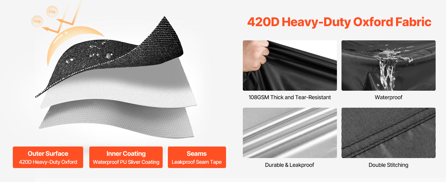 Tento poťah na vonkajší stôl je vyrobený z odolnej tkaniny 420D Oxford a je odolný proti roztrhnutiu, opotrebovaniu a UV žiareniu. Je skonštruovaný tak, aby vydržal vďaka vnútornej vodeodolnej vrstve, takže je ideálny do drsných vonkajších podmienok.