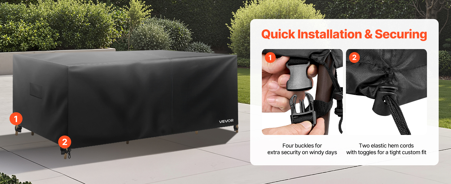 Tento kryt na terasový jedálenský set vybavený štyrmi prackami a dvoma sťahovacími šnúrkami zabezpečuje rýchlu a jednoduchú inštaláciu a zároveň poskytuje bezpečné upevnenie a spoľahlivú ochranu pred vetrom, čím ponúka okamžitú a trvalú ochranu vášho vonkajšieho nábytku.