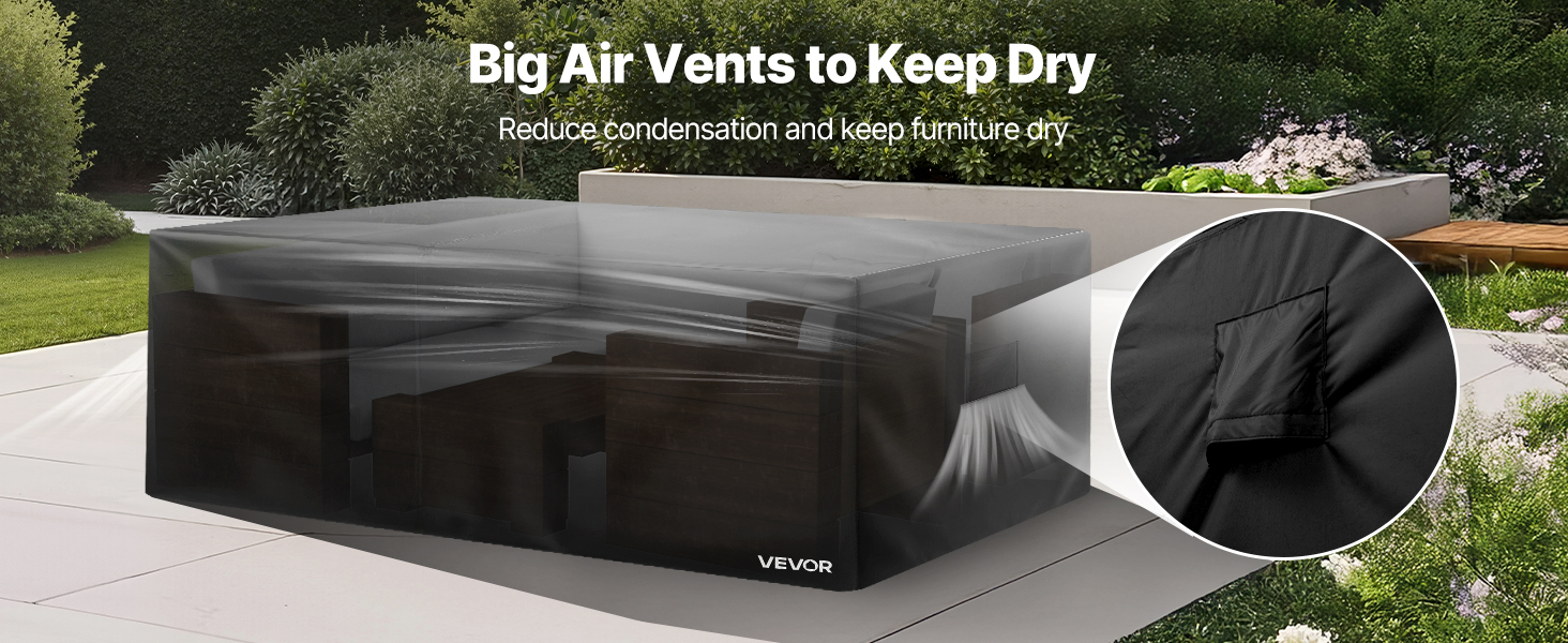 Optimalizované prúdenie vzduchu prostredníctvom dvoch bočných vetracích otvorov pomáha udržiavať váš nábytok suchý a čistý, čím sa predchádza poškodeniu povrchu. Náš kryt záhradného stola zaručuje, že váš nábytok zostane chránený za všetkých poveternostných podmienok a vydrží dlhšie.