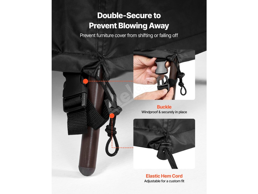 Tento kryt na terasový jedálenský set vybavený štyrmi prackami a dvoma sťahovacími šnúrkami zabezpečuje rýchlu a jednoduchú inštaláciu a zároveň poskytuje bezpečné upevnenie a spoľahlivú ochranu pred vetrom, čím ponúka okamžitú a trvalú ochranu vášho vonkajšieho nábytku.