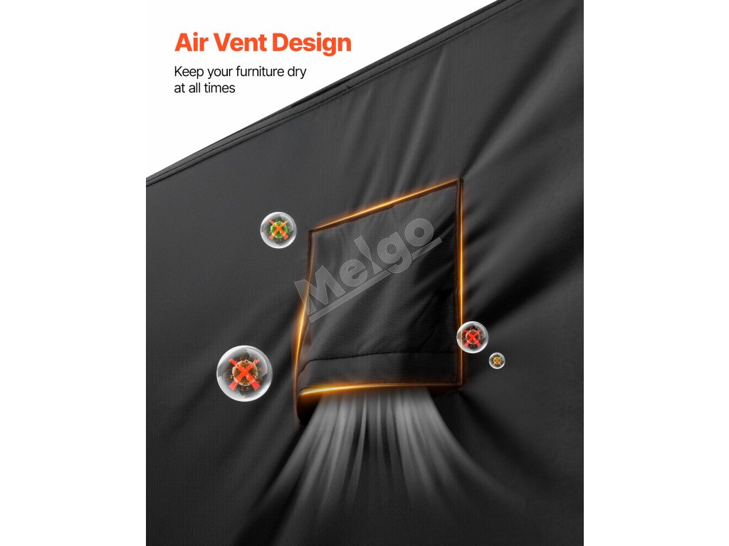 Optimalizované prúdenie vzduchu prostredníctvom dvoch bočných vetracích otvorov pomáha udržiavať váš nábytok suchý a čistý, čím sa predchádza poškodeniu povrchu. Náš kryt záhradného stola zaručuje, že váš nábytok zostane chránený za všetkých poveternostných podmienok a vydrží dlhšie.