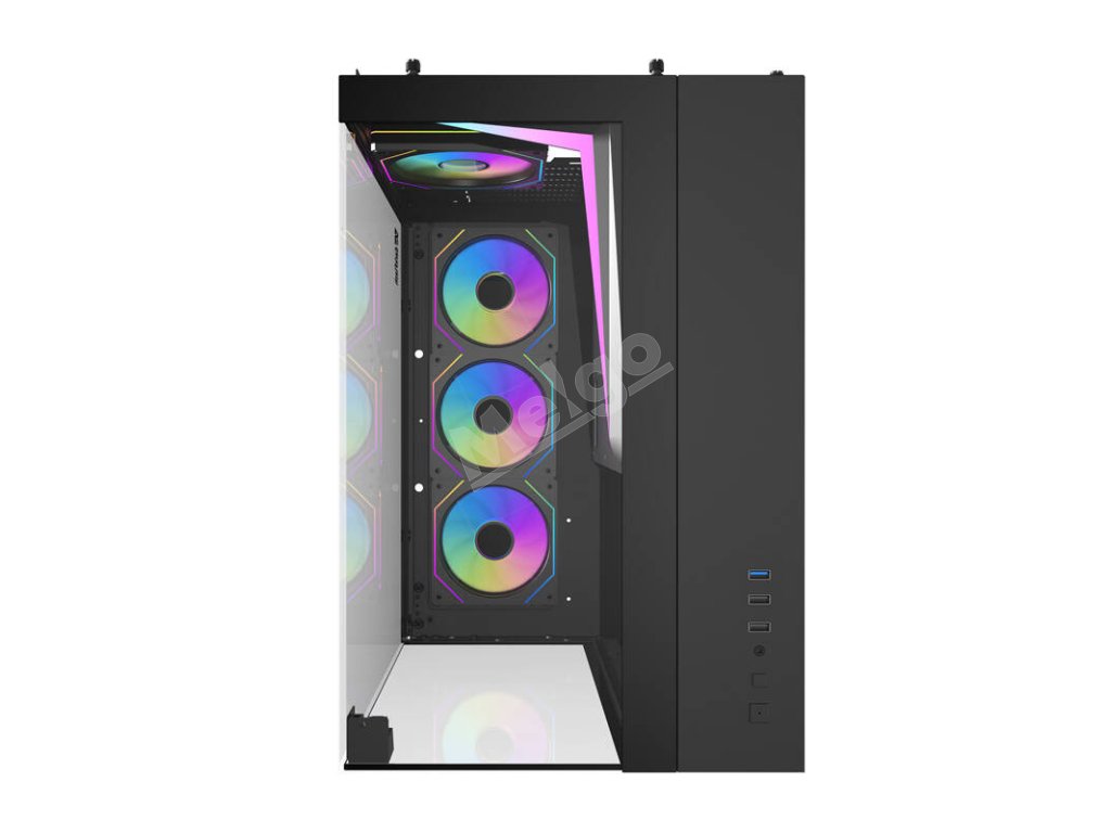 Horný I/O panel je vybavený portom USB 3.0 na vysokorýchlostný prenos dát, 2 portami USB 2.0, ako aj konektorom HD audio. Takéto rozloženie umožňuje ľahký prístup k najdôležitejším konektorom a umožňuje pripojenie rôznych periférnych zariadení. Okrem toho skrinka ponúka tlačidlá napájania a resetovania.
