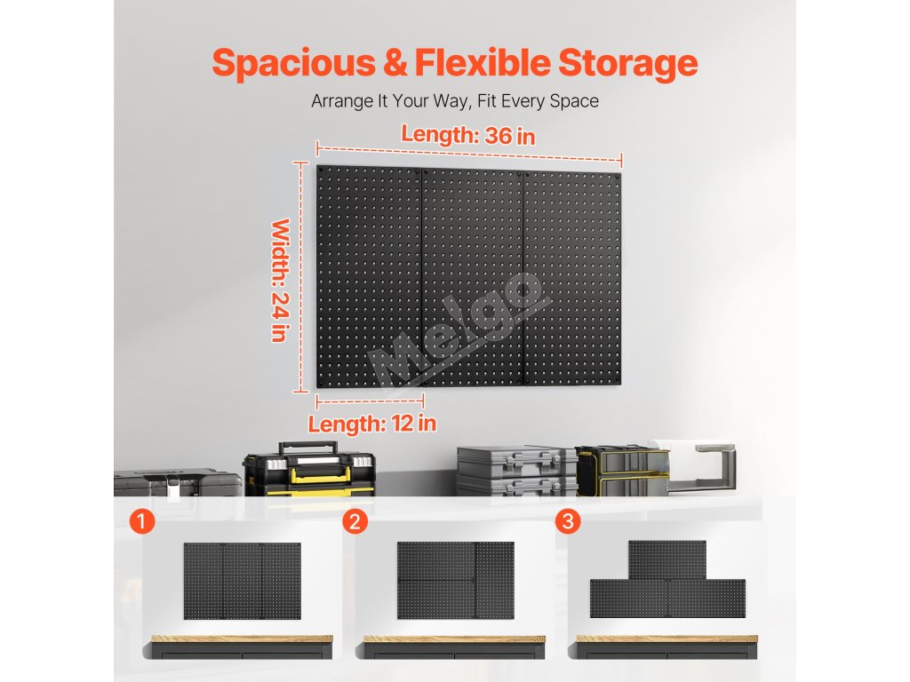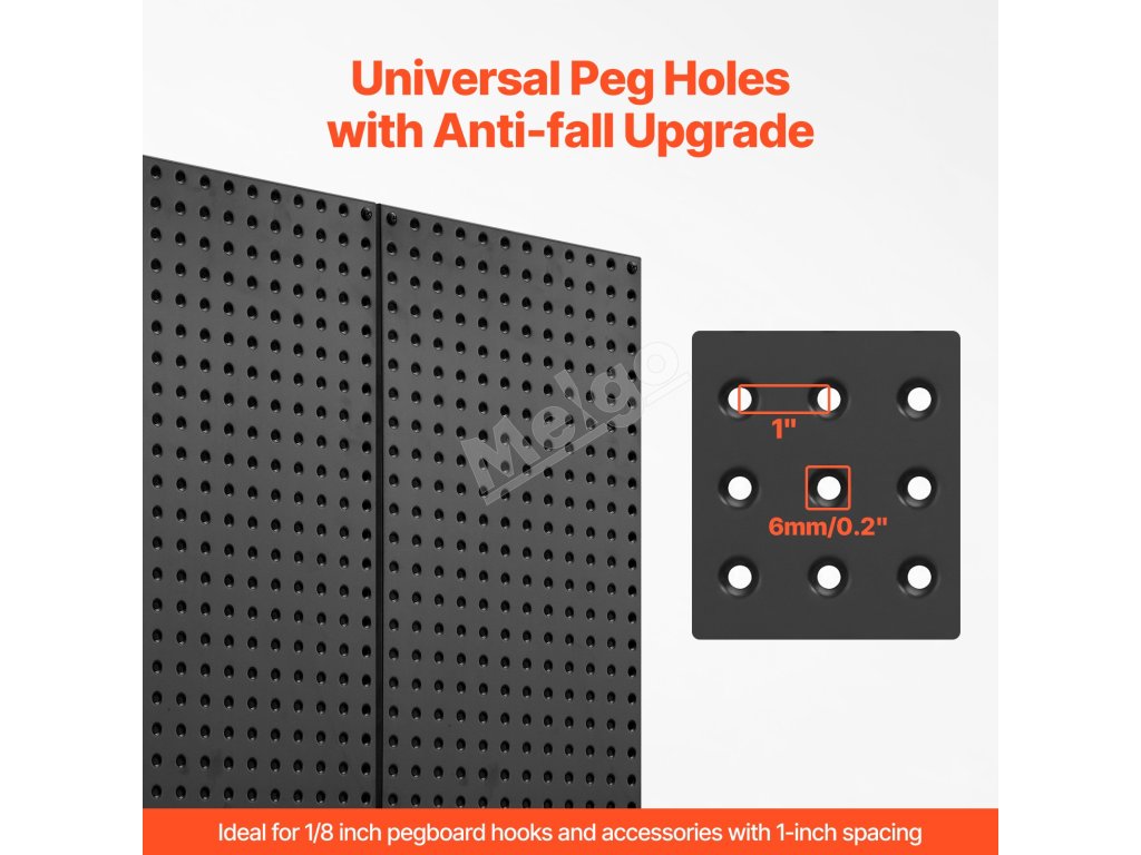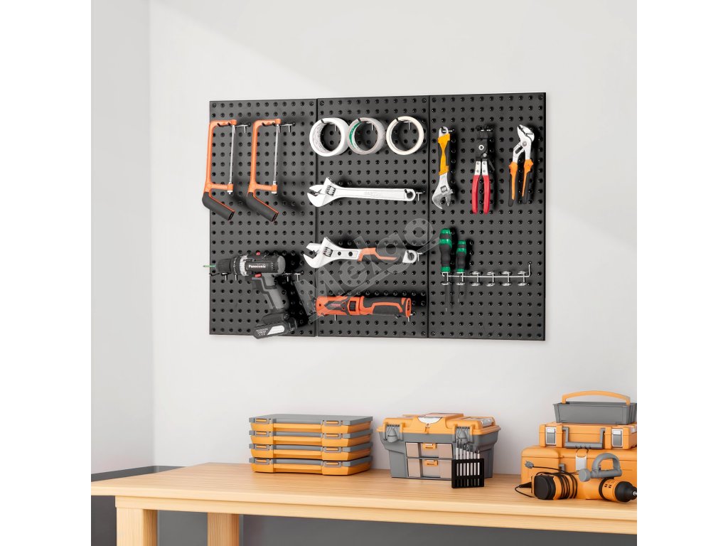 Vďaka konštrukcii so štandardnými otvormi je táto nástenná vešiaková tabuľa kompatibilná so širokou škálou úložného príslušenstva. Či už ide o zavesenie náradia alebo umiestnenie predmetov, spĺňa všetky vaše potreby.