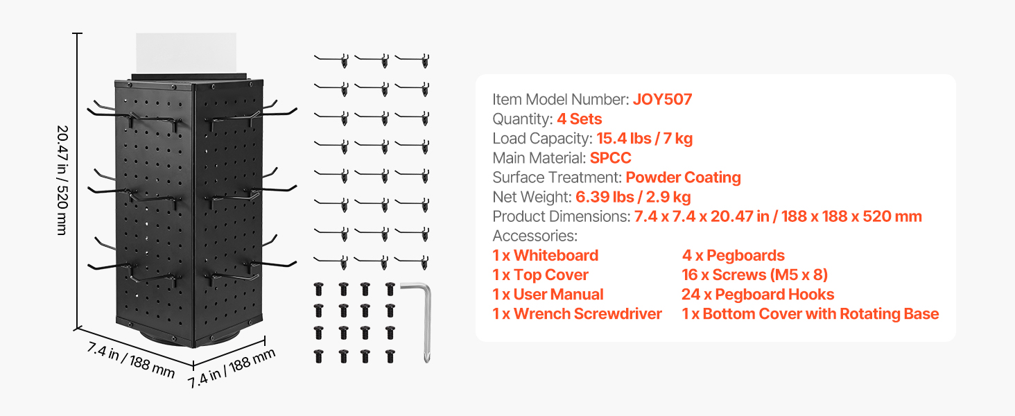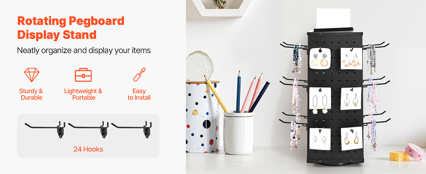 Tento stojan na kolíkové tabule sa dodáva s 24 háčikmi štandardnej veľkosti s priemerom drôtu ⌀0,16 in / 4 mm, ktoré vám pomôžu efektívne usporiadať vaše predmety.