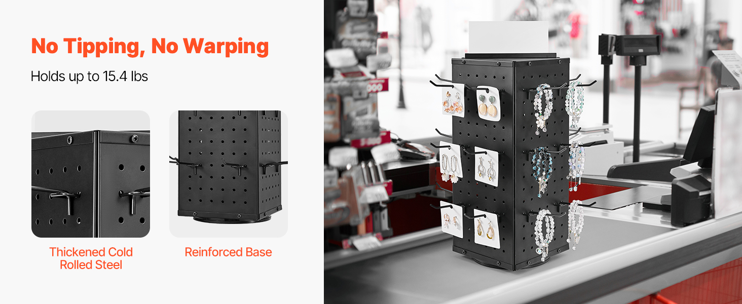 Tento otočný stojan s kolíkovou doskou, vyrobený z odolnej ocele valcovanej za studena, unesie až 15,4 kg. Je robustný, odolný a nedeformuje sa, čím spĺňa vaše každodenné potreby zavesenia.