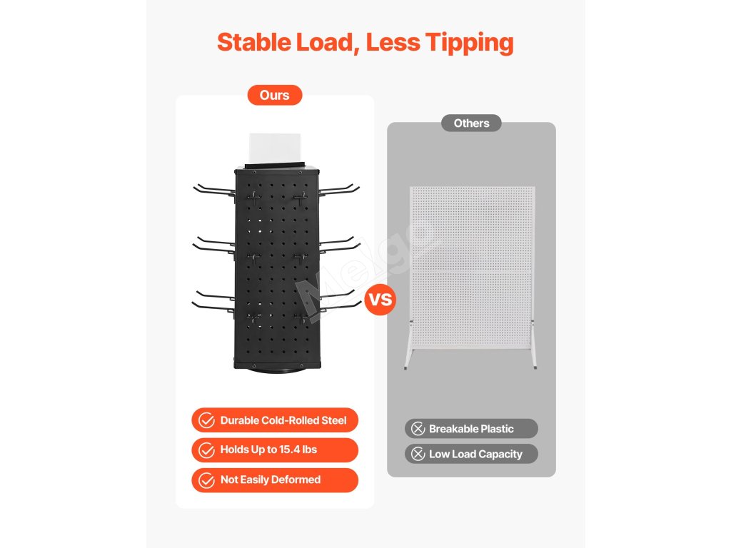 Tento otočný stojan s kolíkovou doskou, vyrobený z odolnej ocele valcovanej za studena, unesie až 15,4 kg. Je robustný, odolný a nedeformuje sa, čím spĺňa vaše každodenné potreby zavesenia.