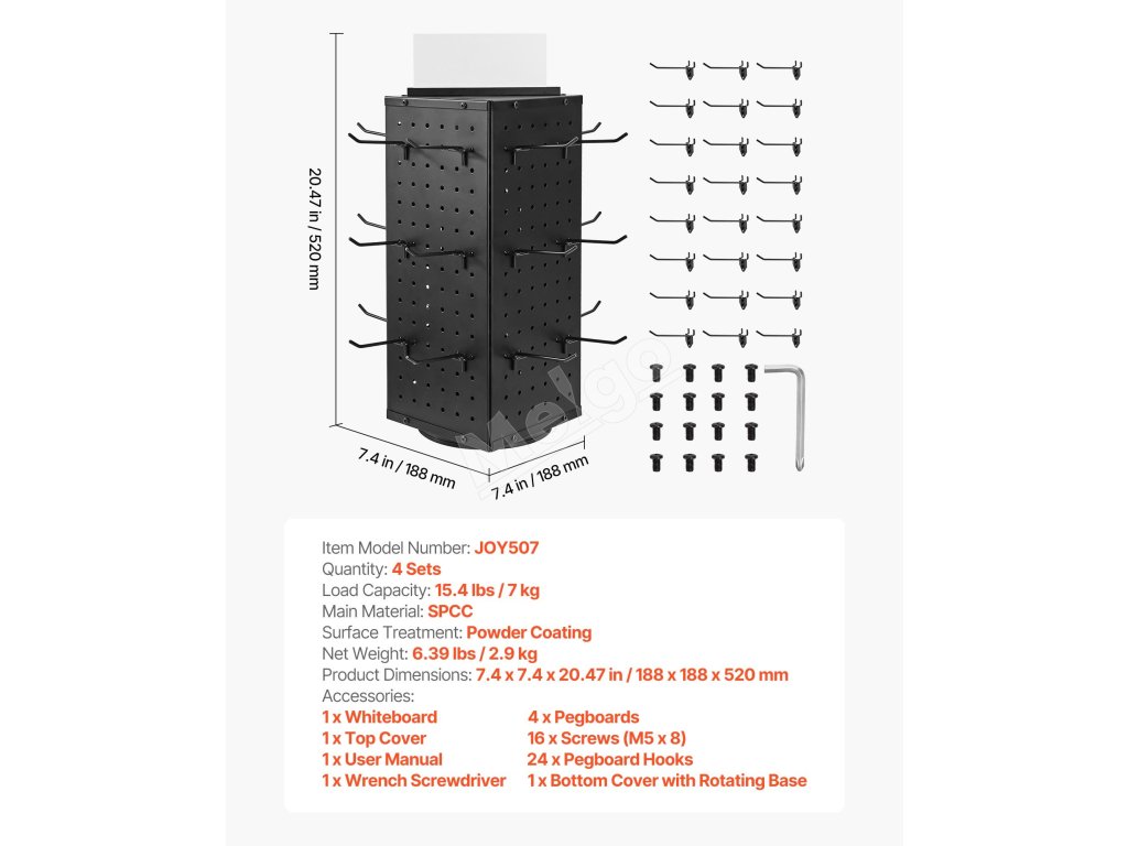 Tento stojan na kolíkové tabule sa dodáva s 24 háčikmi štandardnej veľkosti s priemerom drôtu ⌀0,16 in / 4 mm, ktoré vám pomôžu efektívne usporiadať vaše predmety.