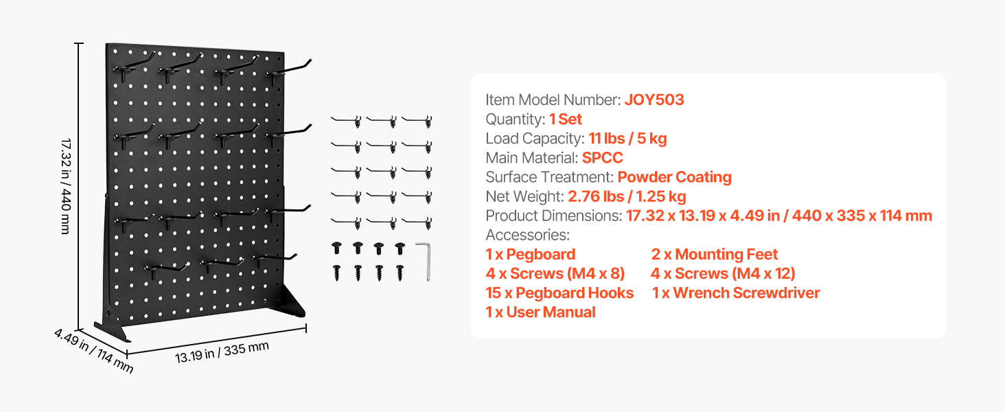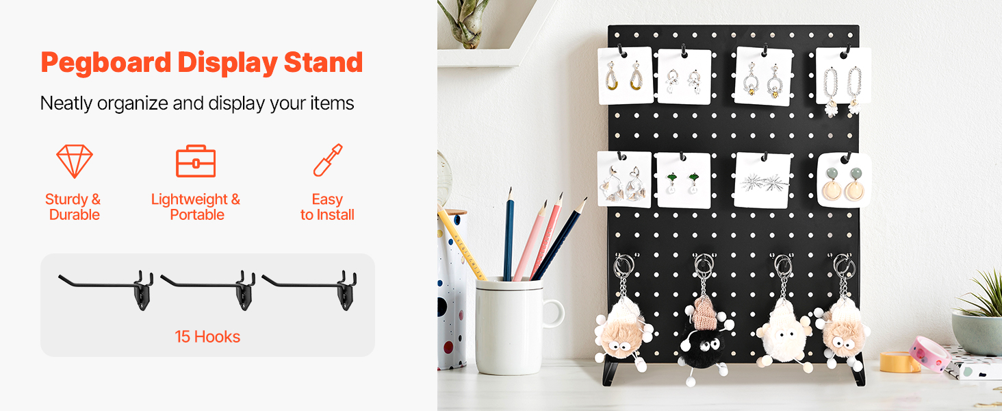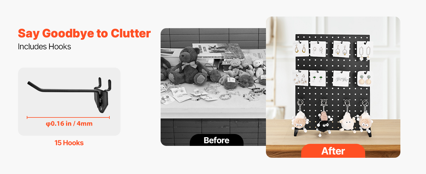 Tento stojan na kolíkové tabule sa dodáva s 15 háčikmi štandardnej veľkosti s priemerom drôtu ⌀0,16 in / 4 mm, ktoré vám pomôžu efektívne usporiadať vaše predmety.