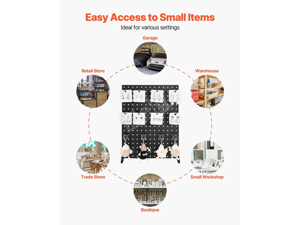 Tento stojan na kolíkové tabule sa dodáva s 15 háčikmi štandardnej veľkosti s priemerom drôtu ⌀0,16 in / 4 mm, ktoré vám pomôžu efektívne usporiadať vaše predmety.