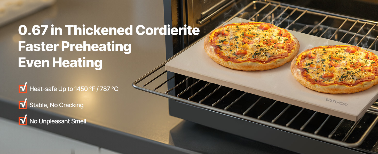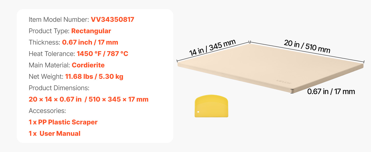 Obdĺžnikový kameň na pizzu je vyrobený zo zhrubnutého kordieritu, odolného voči vysokým teplotám až do 1450 °F/787 °C. Dokáže dlhodobo akumulovať teplo a rovnomerne viesť teplo, čím zabraňuje rozmočenej pizzi a čiastočnému spáleniu a zvyšuje úspešnosť pečenia.