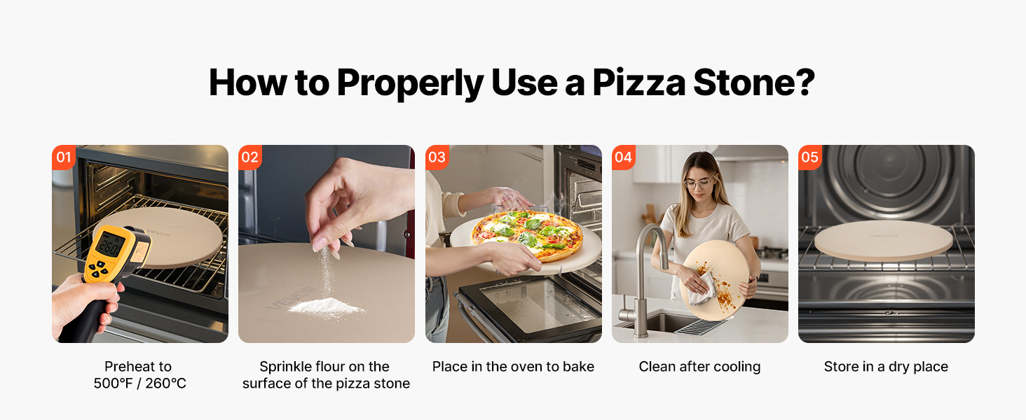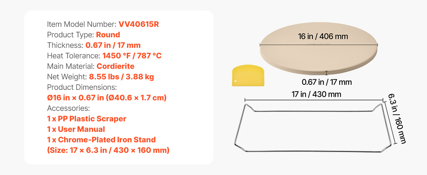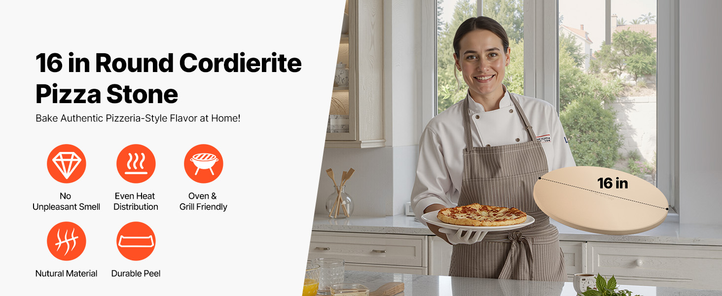 Okrúhly kameň na pizzu je vyrobený zo zhusteného kordieritu, ktorý je odolný voči vysokým teplotám až do 1450 °F/787 °C. Dokáže dlhodobo akumulovať teplo a rovnomerne viesť teplo, čím zabraňuje rozmočenej pizzi a čiastočnému spáleniu a zvyšuje úspešnosť pečenia.