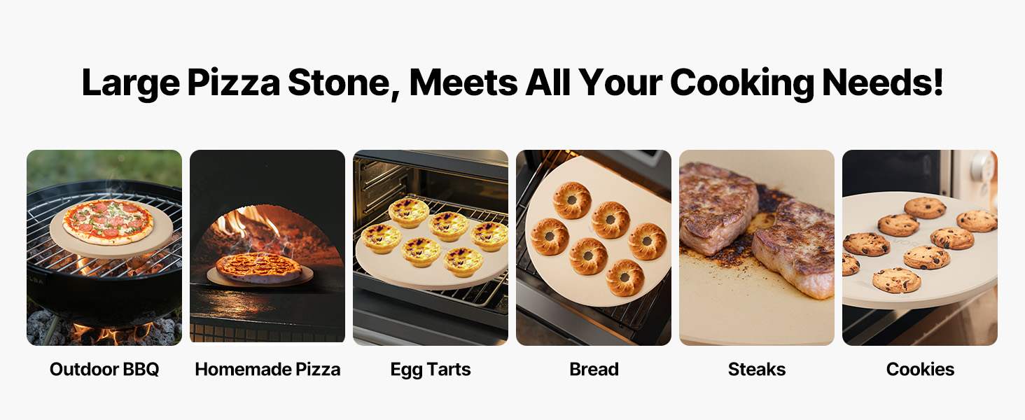 Tento veľký kameň na pečenie môžete použiť na prípravu pizze, chleba, sušienok a iných pochúťok alebo na ohrievanie jedál na obnovenie ich chrumkavej štruktúry. Či už v domácej kuchyni alebo pri vonkajšom grilovaní, všetko bude vďaka nemu chutnejšie!