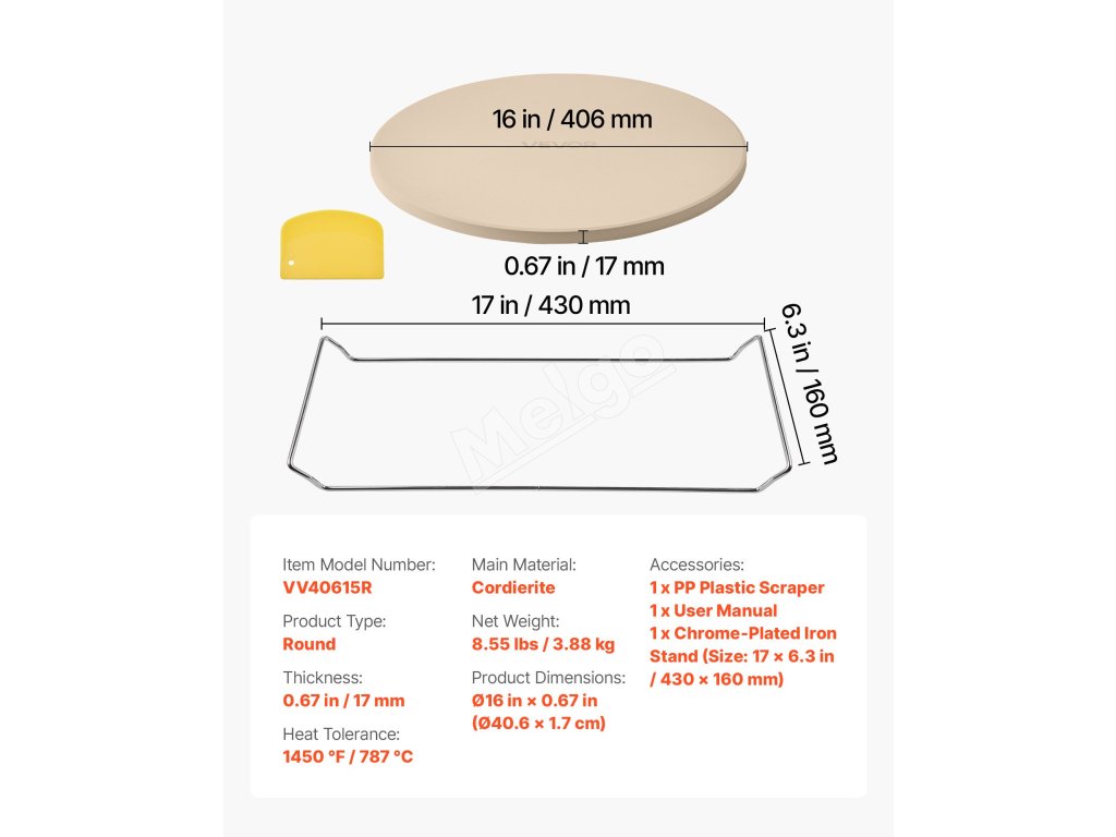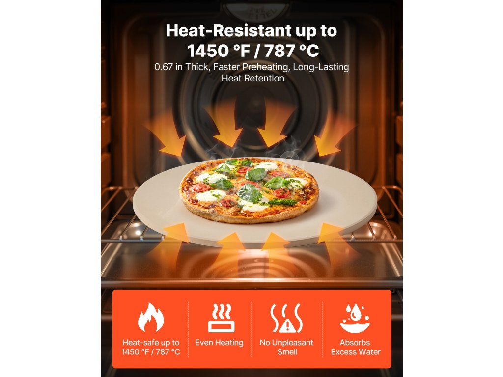 Okrúhly kameň na pizzu je vyrobený zo zhusteného kordieritu, ktorý je odolný voči vysokým teplotám až do 1450 °F/787 °C. Dokáže dlhodobo akumulovať teplo a rovnomerne viesť teplo, čím zabraňuje rozmočenej pizzi a čiastočnému spáleniu a zvyšuje úspešnosť pečenia.