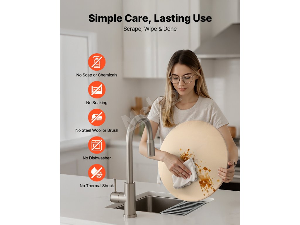 Tento okrúhly kameň na pečenie, ktorého obsluha je jednoduchá a vyžaduje len niekoľko krokov, si po použití vyžaduje len vodu na čistenie a rýchlo schne, čo uľahčuje skladovanie a nenáročnú starostlivosť.