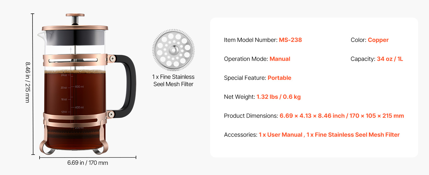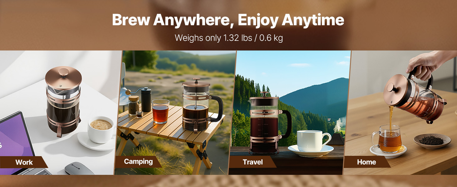 Tento kompaktný a prenosný kávovar french press premení akýkoľvek priestor na váš osobný nápojový kútik - od domácej kancelárie alebo pracovne až po útulný kemp. Vychutnajte si kávu v kaviarenskej kvalite, nech ste kdekoľvek.