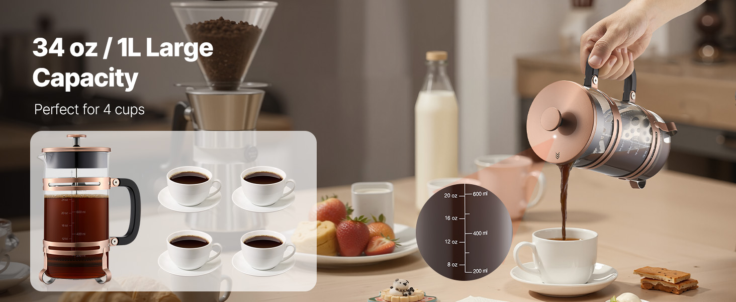 S týmto veľkoryso dimenzovaným french pressom môžete variť kávu pre skupinu. Jasné meracie značky uľahčujú nastavenie objemu varenia podľa vašich potrieb - ideálne na stretnutia aj každodenné používanie.