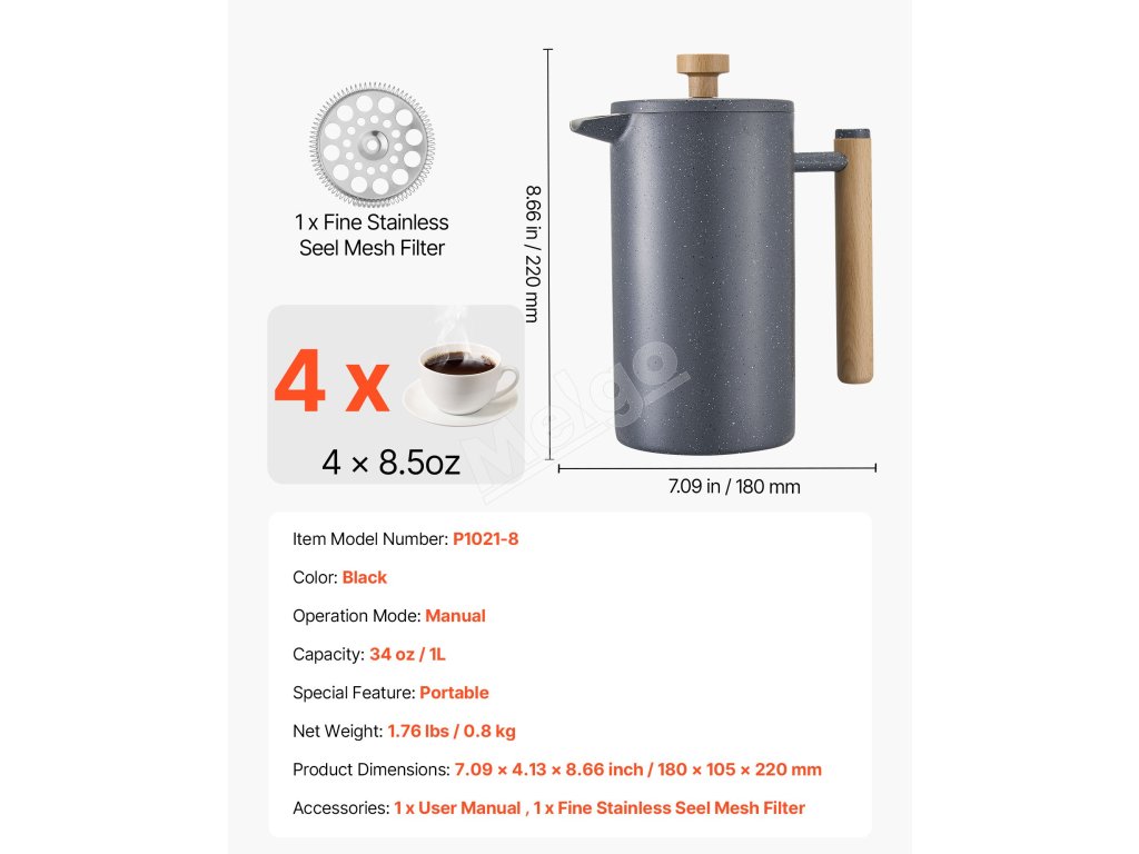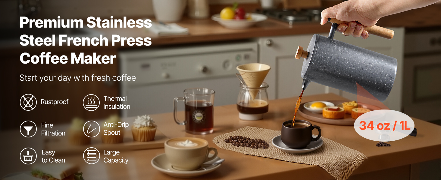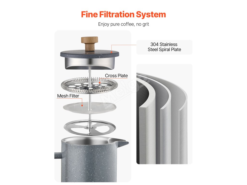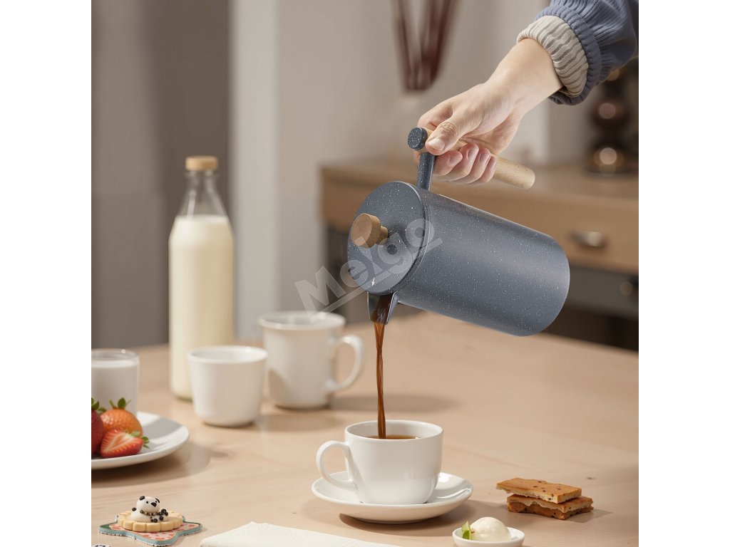 French press kávovar má dvojvrstvovú konštrukciu z nehrdzavejúcej ocele, ktorá zaručuje dlhodobú trvanlivosť a odolnosť proti hrdzi. Vákuová izolácia udržiava kávu horúcu a aromatickú, zatiaľ čo výlevka proti odkvapkávaniu zabezpečuje plynulé nalievanie.