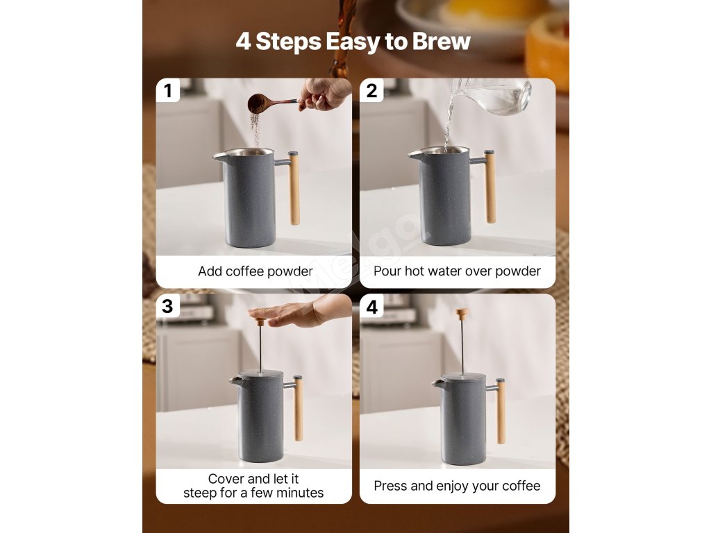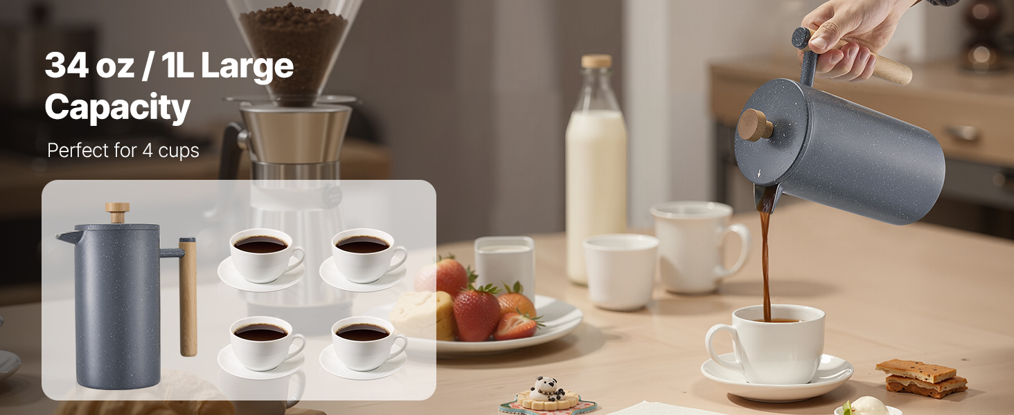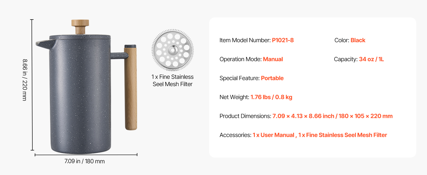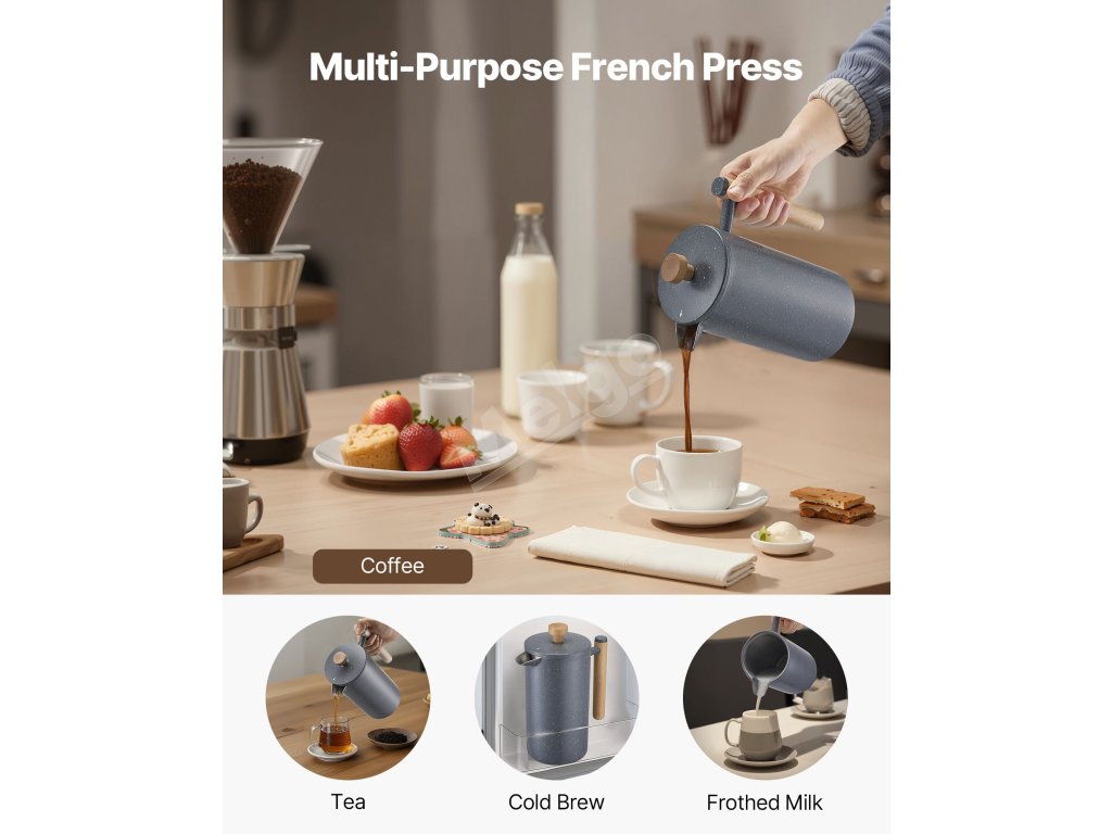 French press kávovar má dvojvrstvovú konštrukciu z nehrdzavejúcej ocele, ktorá zaručuje dlhodobú trvanlivosť a odolnosť proti hrdzi. Vákuová izolácia udržiava kávu horúcu a aromatickú, zatiaľ čo výlevka proti odkvapkávaniu zabezpečuje plynulé nalievanie.